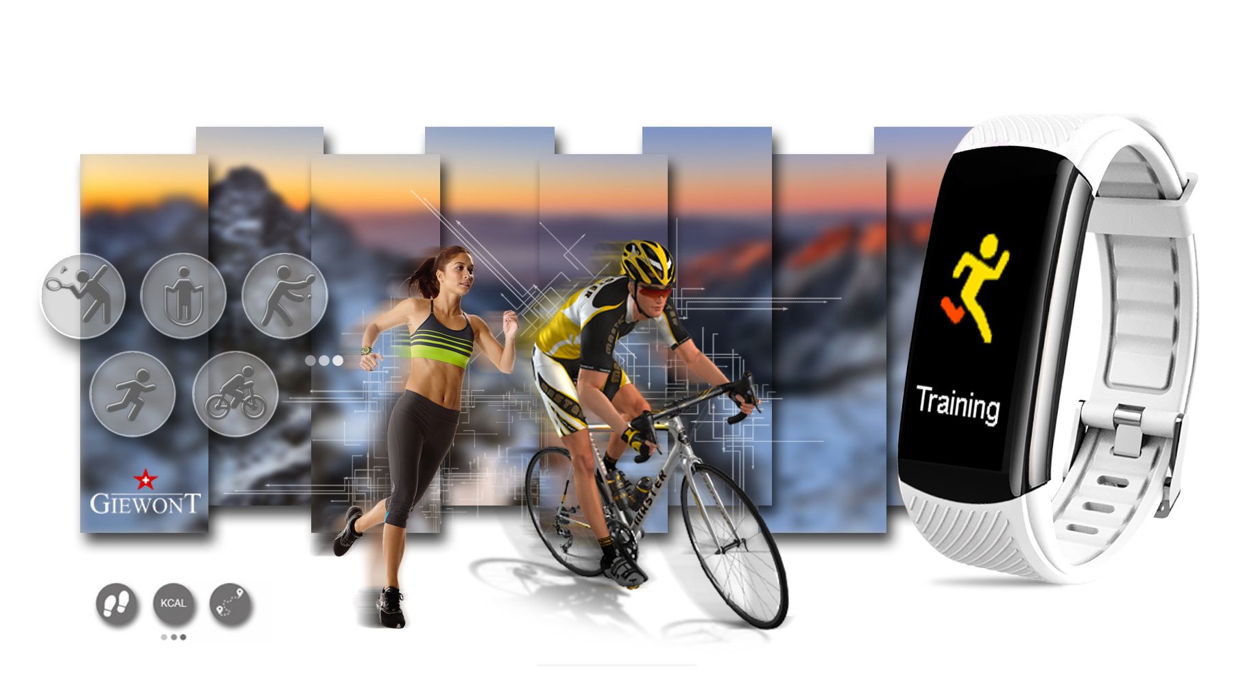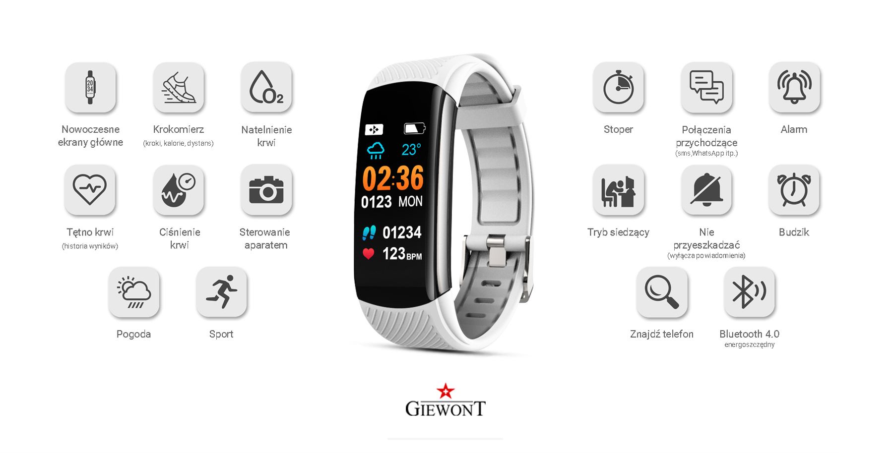 SMARTBAND GIEWONT GW200 Smukła sportowa opaska, towarzysząca Ci podczas codziennych aktywności. Jej lekka obudowa sprawdzi się znakomicie podczas jazdy na rowerze, biegania i uprawiania innych sportów (z 5 różnych dyscyplin). Z tym smartbandem możesz w pełni cieszyć się z każdego ruchu – opaska Giewont GW200 pozwoli Ci zaplanować i kontrolować czas, dystans, spalanie kalorii i efekt treningu. Z tym smartbandem nie przegapisz tego, co ważne. Wiadomości z Facebook, Twitter, Whatsapp, Skype itp. wyświetlane są na zegarku w czasie rzeczywistym – wystarczy podnieść rękę, aby wyświetlić wiadomości! Nie musisz się odrywać od aktywności, ta opaska dotrzymuje Ci kroku podczas przygody, która się już rozpoczęła i trwa. Opaska posiada klasę wodoszczelności IP67, dlatego jest odporna na przypadkowe zalania, zachlapania oraz deszcz. Dodatkowo Giewont GW200 po podłączeniu z aplikacją wyświetla dane o pogodzie – informacje, są odświeżane co godzinę. Dlatego teraz możesz dostosować aktywność do warunków pogodowych i cieszyć się treningiem zarówno w słoneczne jak i deszczowe dni. Całość dopełnia funkcja bezprzewodowego robienia zdjęć z aparatu telefonu za pomogą bezprzewodowego połączenia z zegarkiem. Uwaga!Smartband nie posiada ładowarki – ładowanie następuje po wpięciu do portu USB lub do ładowarki z takim wejściem.Dzienny zapis kroków dostępny jest tylko w aplikacji! Na wyświetlaczu Smartbanda jest podgląd zsumowanych kroków ze wszystkich dni!