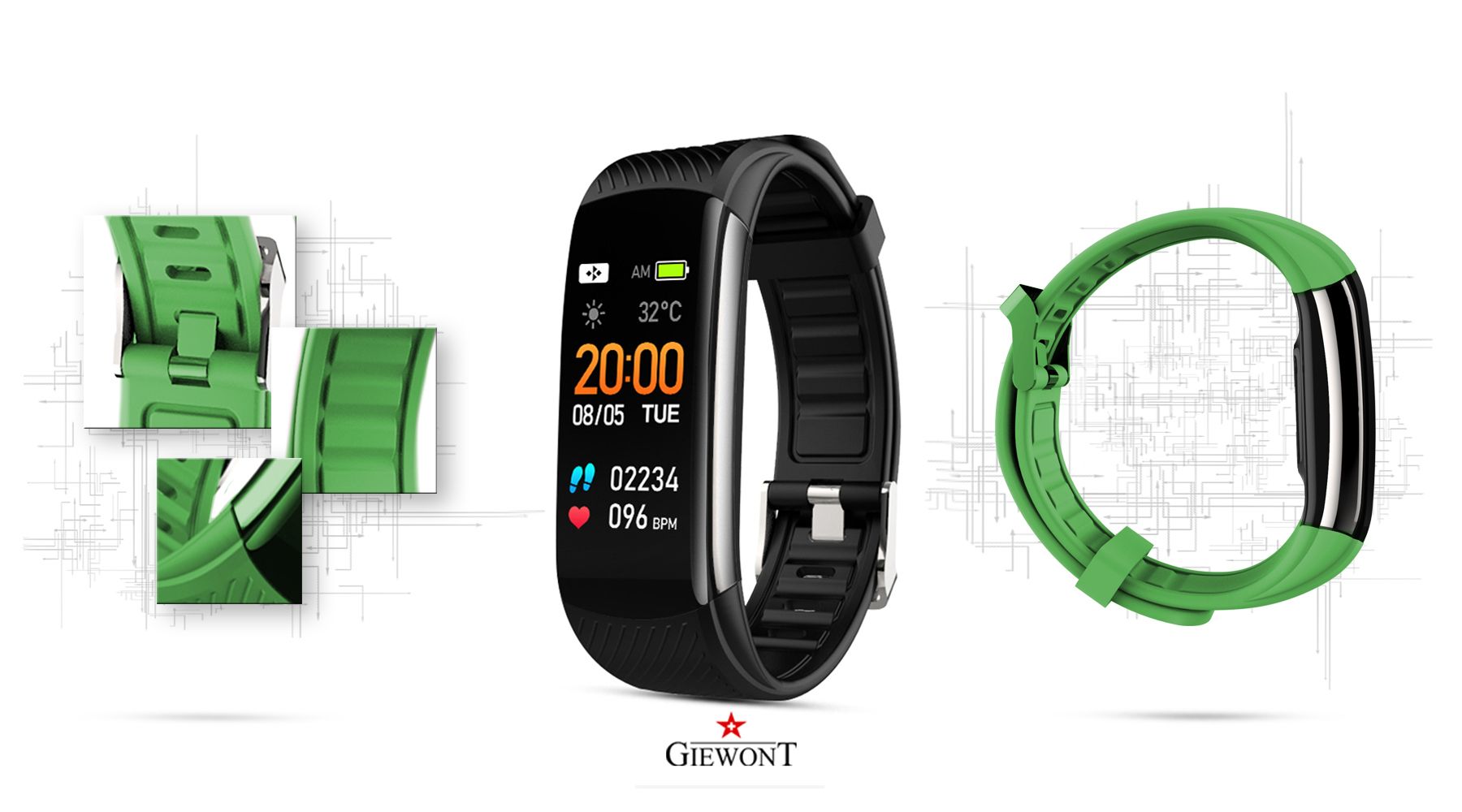 Wymiary smartbanda GW200 Lekki i niezwykle odporny na trudne warunki atmosferyczne silikonowy pasek, który w łatwy sposób wymienisz w smartbandzie Giewont GW200. Dodatkowy zielony silikonowy pasek Lekki i niezwykle odporny na trudne warunki atmosferyczne silikonowy pasek, który w łatwy sposób wymienisz w smartbandzie Giewont GW200. Połączenie bluetooth Ten smartwatch możesz połączyć ze swoim Smartfonem. Kompatybilność z systemem Android 5.0 i nowszy oraz iOS 9.0 i nowszy.Oznacza to, że smartwatch połączy się ze wszystkimi telefonami na systemie ANDROID i iOS.