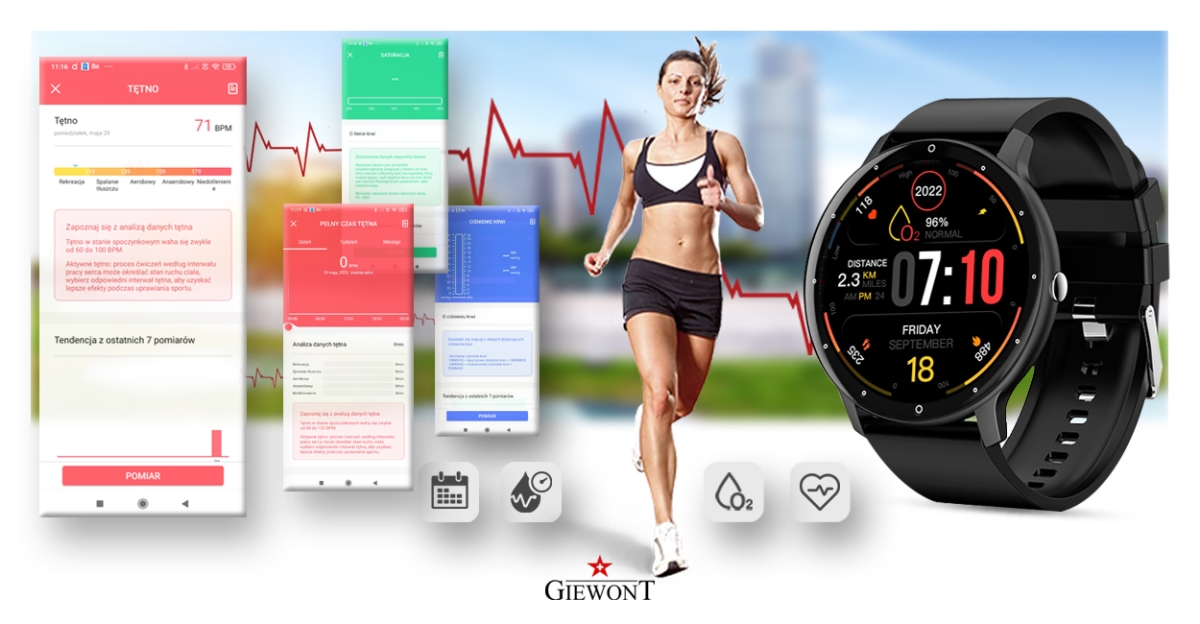 Dzięki sensorowi możesz w każdej chwili zmierzyć lub wykonać pomiar: ciśnienie krwi, tętno lub saturację – zawartość tlenu we krwi w swoim organizmie. Kontroluj wyniki podczas każdej aktywności fizycznej. Niezależnie czy jeździsz na rowerze, biegasz, czy też po prostu jesteś w pracy lub odpoczywasz. Twój smartwatch Giewont stanie się osobistym asystentem dbającym o twoje zdrowie każdego dnia.