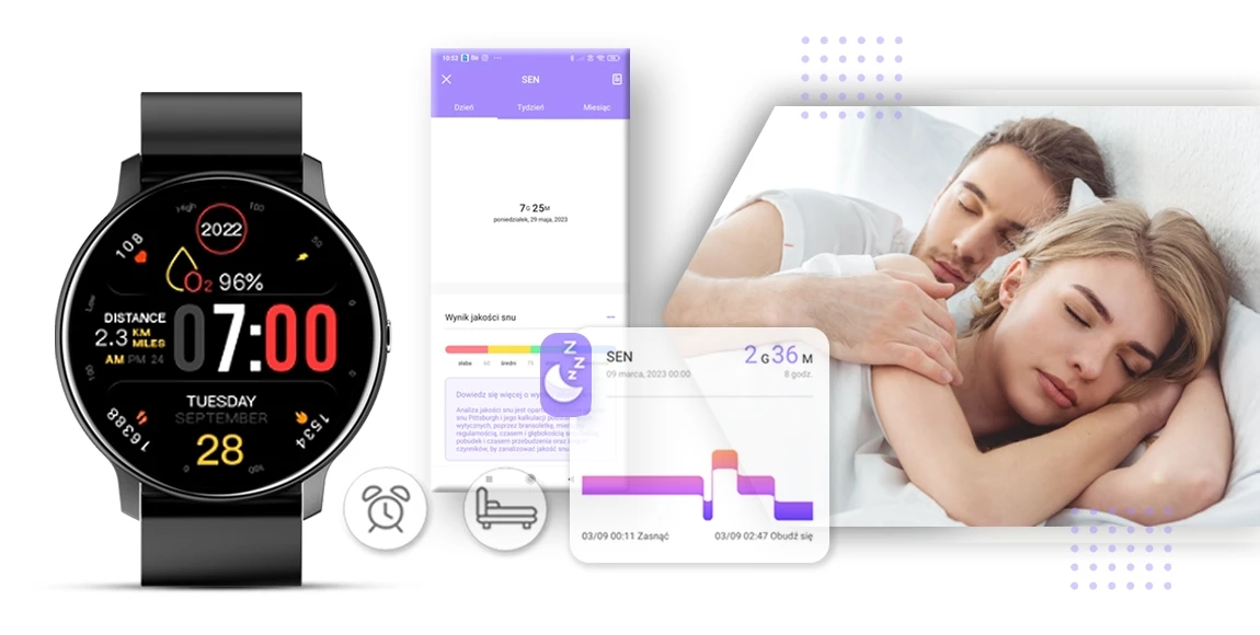 Funkcja ta pozwala monitorować czas i jakoś snu każdej nocy. Po zsynchronizowaniu danych z aplikacją możesz sprawdzać i analizować jakość swojego snu. Historia pokaże jak śpisz i czy twój sen jest dobrej jakości. Po ciężkim dniu każdy musi się wyspać, żeby nabrać sił na kolejny dzień i w tym pomoże Ci ten smartwatch.