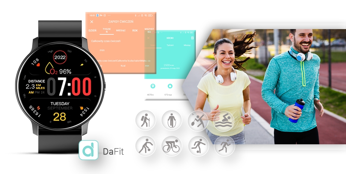 Funkcje pomiarowe i aktywnościowe smartwatcha lub smartbandu mają charakter orientacyjny i nie zastępują urządzeń medycznych ani konsultacji lekarskiej.