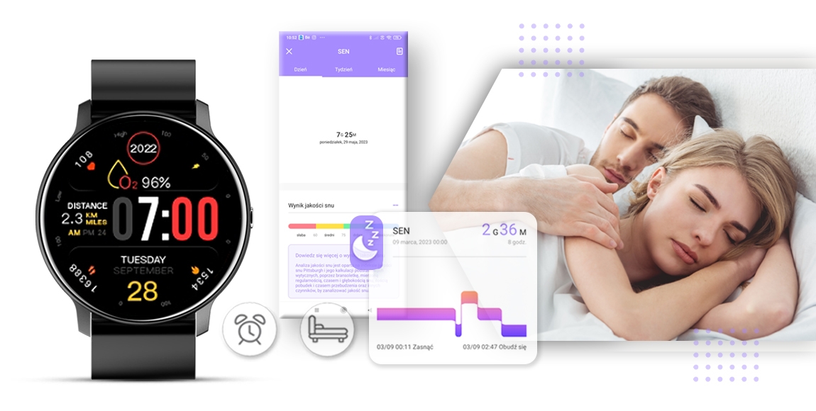 - Pomiar tętna, saturacji, ciśnienia i monitor snu