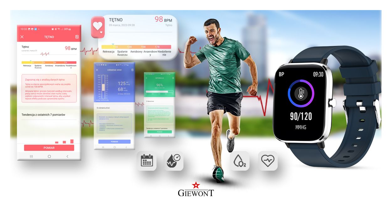 To niezwykle elegancki i modny smartwatch na bransolecie z dodatkowym paskiem silikonowym, który będzie Ci towarzyszył podczas codziennych aktywności. Jego lekka obudowa sprawdzi się znakomicie podczas jazdy na rowerze, biegania i uprawiania innych sportów, jakie umożliwia ten smartwatch. Z tym smartwatchem możesz w pełni cieszyć się z każdego ruchu – Giewont GW230 pozwoli Ci zaplanować i kontrolować czas, dystans, spalanie kalorii i efekt treningu. Podczas aktywności lub relaksu, możesz słuchać i sterować muzyką. Z tym smartwatchem możesz wykonywać i odbierać połączenia telefoniczne, nie przegapisz również to, co ważne. Wiadomości z Facebook, Twitter, Whatsapp, Skype itp. wyświetlane są na ekranie w czasie rzeczywistym – wystarczy podnieść rękę, aby wyświetlić wiadomości! Nie musisz się odrywać od aktywności, ten model dotrzyma Ci kroku podczas przygody, która się już rozpoczęła i trwa. Zdrowie każdego człowieka jest bezcenne! Model ten pozwana na wykonywanie i kontrolowanie najważniejszych parametrów zdrowotnych, takich jak ciśnienie krwi, tętno oraz saturację – natlenienie krwi. Podczas gdy zmagamy się ze zdrowiem lub uprawiamy sport, kontrolowanie tych parametrów jest nieocenione. Smartwatch Giewont GW230 posiada klasę wodoszczelności IP67, jest odporny na przypadkowe zalania, zachlapania oraz deszcz. Nie musisz martwić się o smartwatch gdy pada deszcz.. Dodatkowo ten model Giewont po podłączeniu z aplikacją wyświetla dane o pogodzie. Dlatego teraz możesz dostosować aktywność do warunków pogodowych i cieszyć się spacerem lub treningiem zarówno w słoneczne jak i deszczowe dni. Niech nic nie stanie Ci na przeszkodzie w realizacji codziennych celów! Giewont GW230 pomaga kontrolować zdrowie i sprawność organizmu – w aplikacji możesz ustawić, co jaki interwał czasowy urządzenie ma przypomnieć o trybie siedzącym i nawodnieniu. Całość dopełnia funkcja robienia zdjęć w twoim telefonie za pomogą smartwatcha, poprzez bezprzewodowe połączenie bluetooth. Uzyskaj harmonię pomiędzy aktywnością a wypoczynkiem! Pomoże Ci w tym takie narzędzie, jak monitor braku aktywności. Jeżeli się zasiedzisz – GW230 przypomni Tobie o dłuższym czasie bez aktywności. Koniec wymówek, Twój nowy smartwatch Giewont wie, że ruch to zdrowie! |