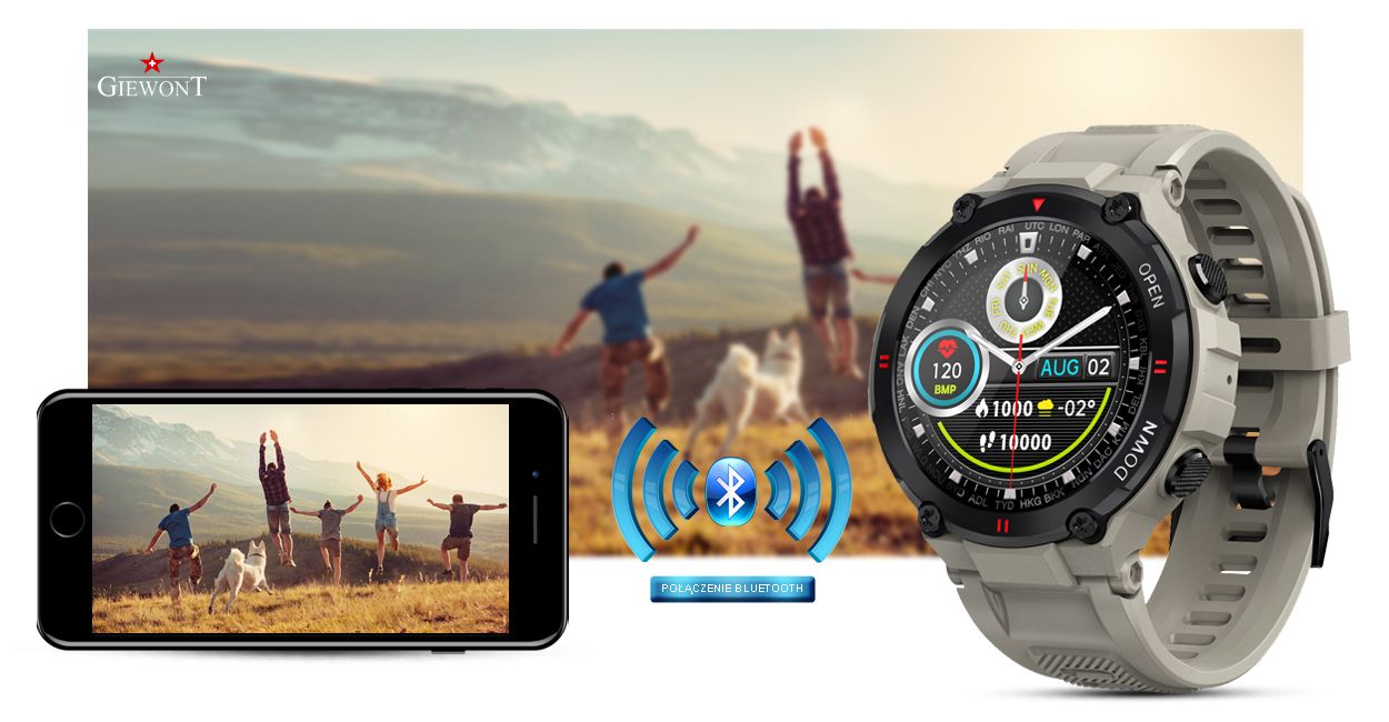 Oznacza to, że smartwatch połączy się ze wszystkimi telefonami na systemie ANDROID i iOS.