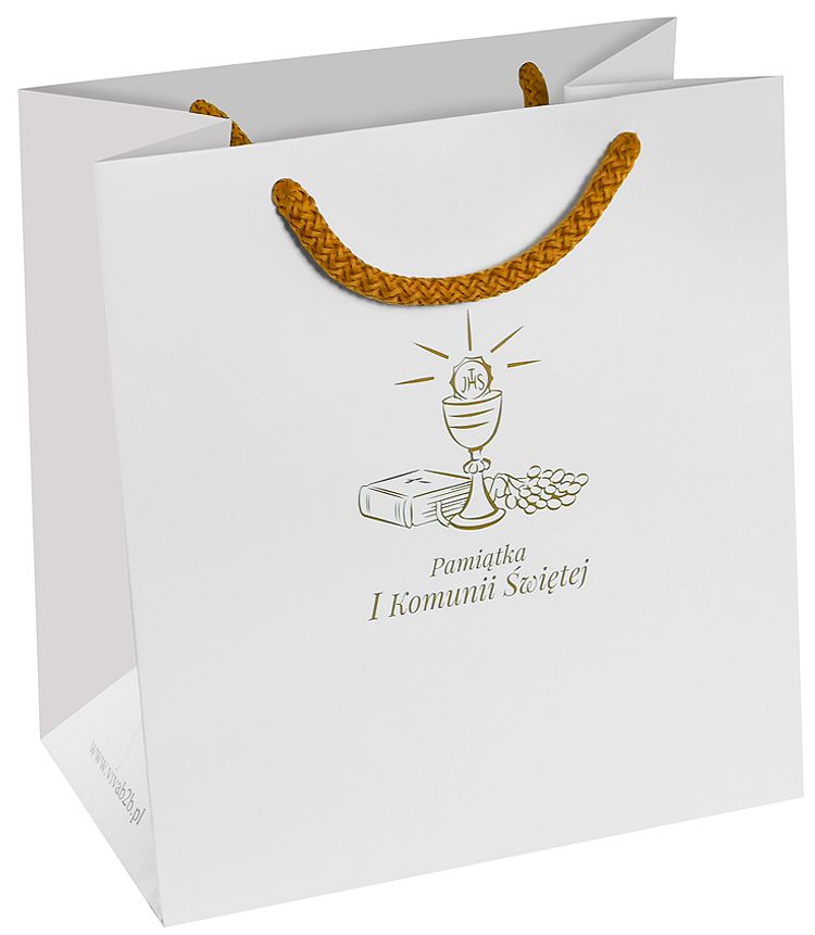 Biała torebka komunijna ze złotym nadrukiem „Pamiątka I Komunii Świętej” oraz złotym sznurkiem.