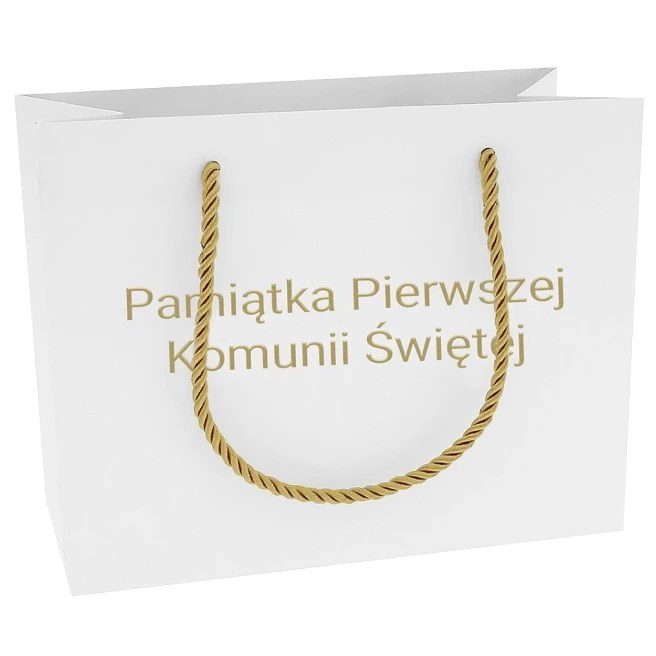 Torebka komunijna biała ze złotym nadrukiem oraz złotym sznurkiem
