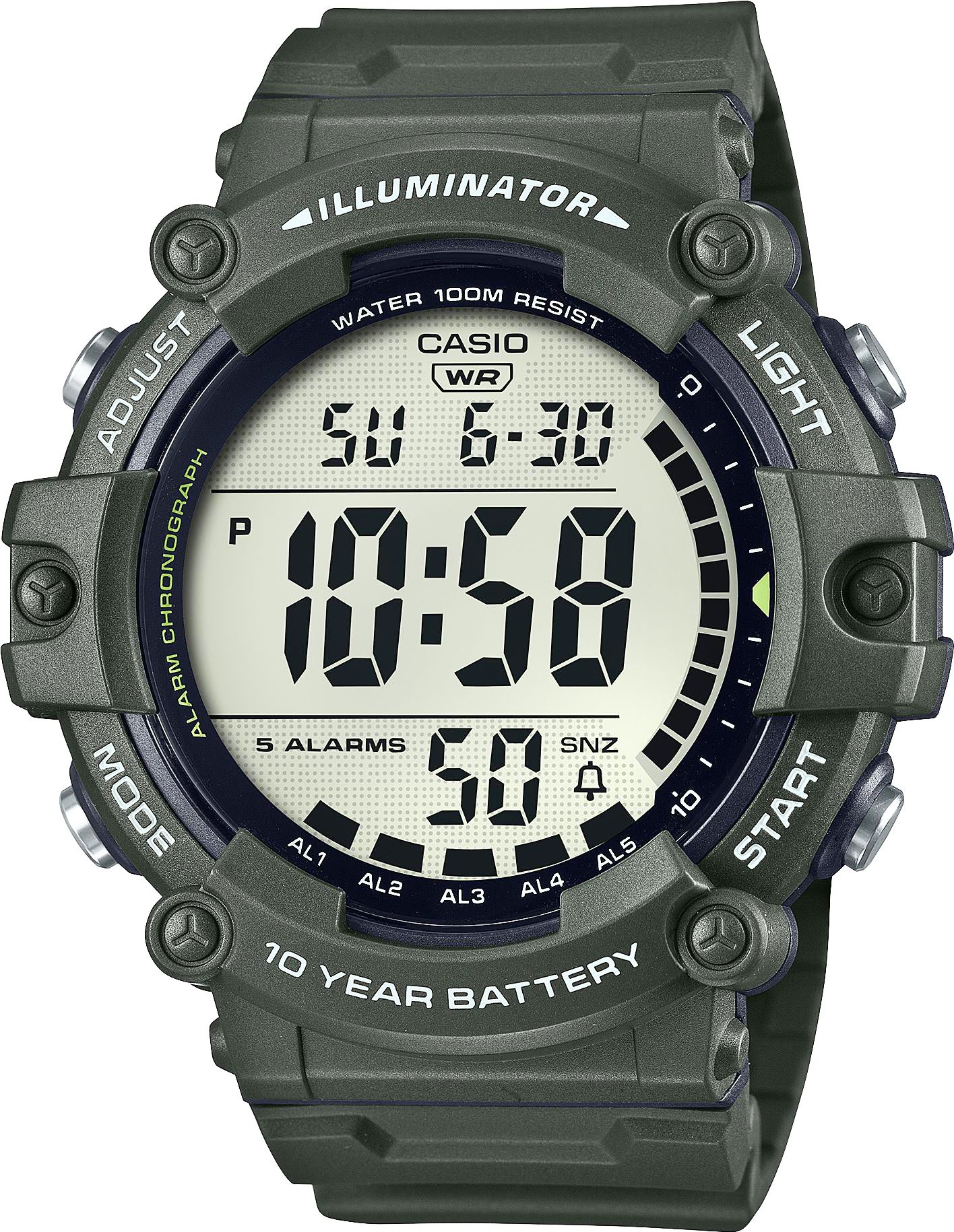 - Tarcza: Kwarcowa. Automatyczny kalendarz: rozbudowany datownik, który automatycznie dopasowuje datę w przypadku krótszych miesięcy; timer: możliwość odliczania od zaprogramowanego czasu do zera; zegar 12/24: możliwość wyświetlania godziny w trybach 12 i 24 godzinnych; stoper: 1/100 mierzy czas do jednej setnej sekundy; Dual-Time: możliwość ustawienia drugiego niezależnego czasu; Alarm: zegarek może sygnałem dźwiękowym informować 5 razy w ciągu doby, w tym tryb drzemki oraz opcja sygnalizacji o pełnych godzinach