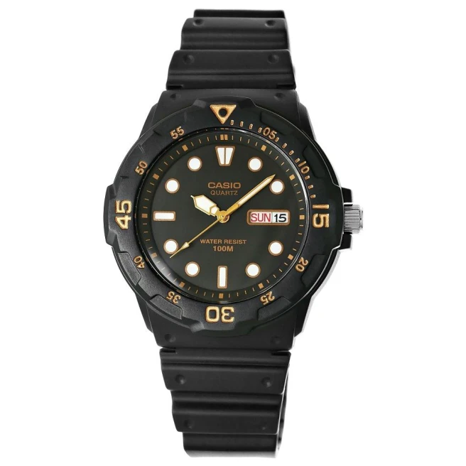 Casio MRW-200H-1EVDF to męski model w nurkowym stylu, z obrotowym bezelem i prostą analogową tarczą uzupełnioną oknem dnia i daty. Ta seria wygląda sportowo, ale nadal zostaje lekka i wygodna dzięki żywicznej kopercie oraz paskowi.