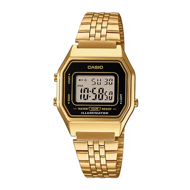 Casio Vintage LA680WGA-1DF to mały cyfrowy model o biżuteryjnym, retro charakterze. Złota bransoleta, smukła koperta i klasyczny moduł Casio tworzą tu bardzo rozpoznawalny zegarek w stylu vintage.