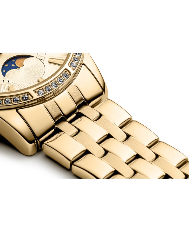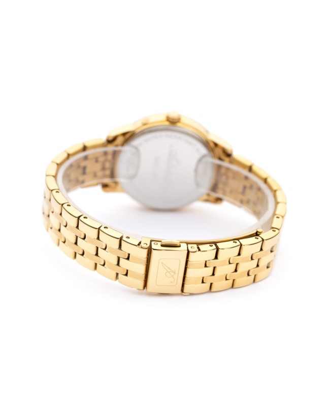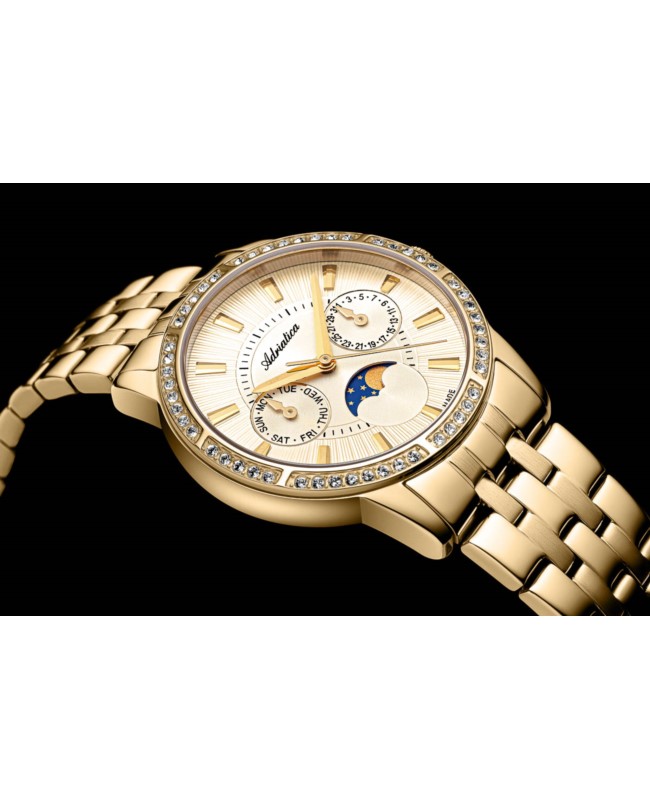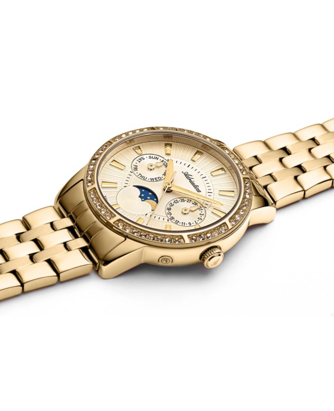 Złota koperta wykonana ze stali szlachetnej 316L ozdobiona została kryształkami Swarovskiego, które subtelnie odbijają światło, dodając zegarkowi elegancji i charakteru luksusowej biżuterii. Delikatne żłobienia pierścienia tarczy, precyzyjnie rozmieszczone indeksy i dopracowane detale to dowód na to, że Adriatica dba o każdy element swojego dzieła.