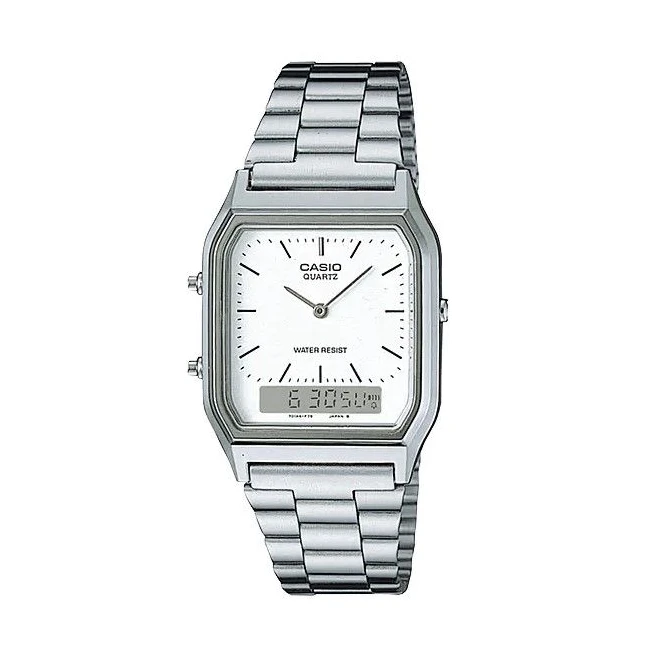 Casio Vintage AQ-230A-7DMQ to jedna z najbardziej charakterystycznych analogowo-cyfrowych odsłon linii Vintage. Smukła koperta, stalowa bransoleta i niewielkie okienko cyfrowe tworzą tu lekki retro model, który łatwo łączy codzienną wygodę z bardziej stylowym wyglądem.