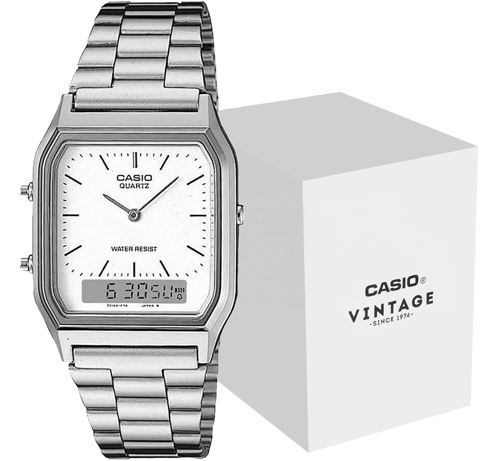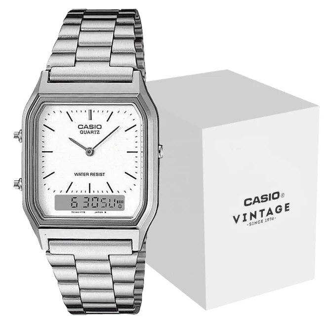 Casio Vintage AQ-230A-7DMQYES to jedna z najbardziej charakterystycznych analogowo-cyfrowych odsłon linii Vintage. Smukła koperta, stalowa bransoleta i niewielkie okienko cyfrowe tworzą tu lekki retro model, który łatwo łączy codzienną wygodę z bardziej stylowym wyglądem.