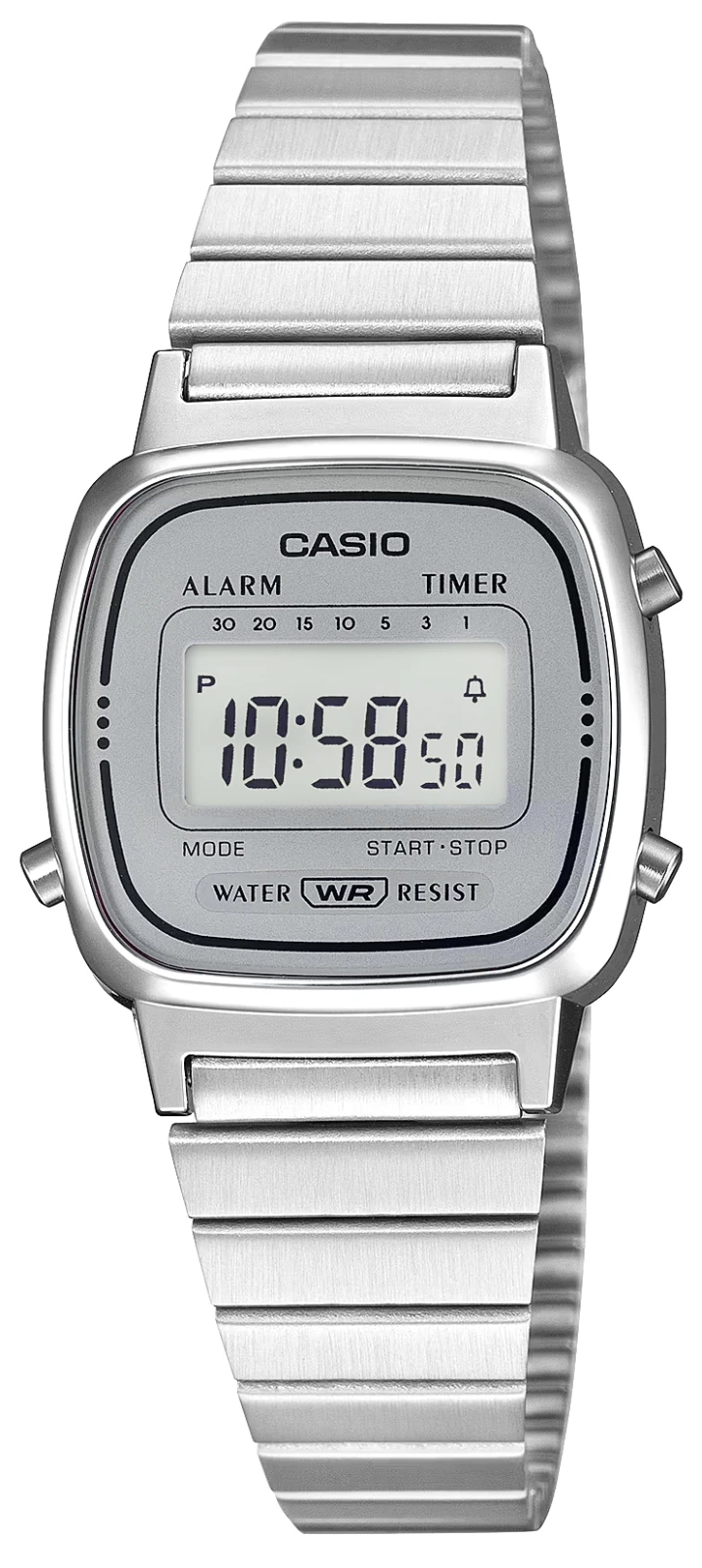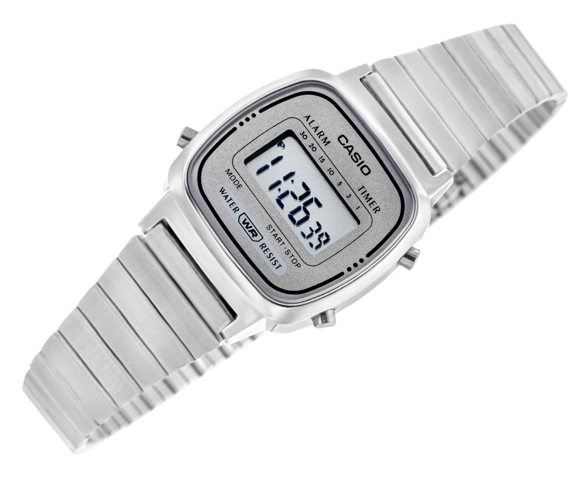Cyfrowy model CASIO LA670WA-7DF to idealny wybór dla kobiet, które kochają modę, ale nie gonią za nią ślepo – wybierają to, co pasuje do ich własnego rytmu i stylu. Smukła, zaokrąglona koperta otoczona metalową bransoletą przywołuje klimat lat 70., dodając każdej stylizacji odrobinę retro uroku i nonszalanckiej elegancji.