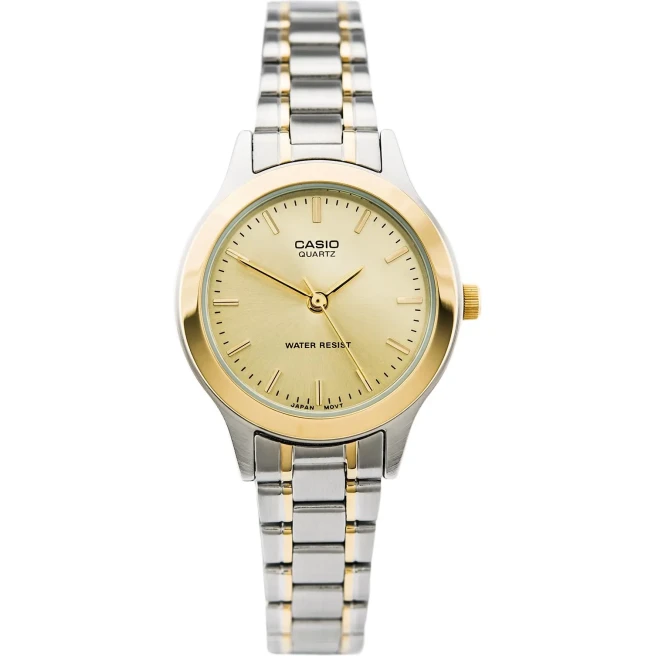 Casio LTP-1128G-9ARDF łączy niewielką kopertę z bransoletą srebrno-złotą, dzięki czemu wygląda cieplej i bardziej biżuteryjnie niż jednokolorowe wersje stalowe. To nadal lekki damski zegarek na co dzień.