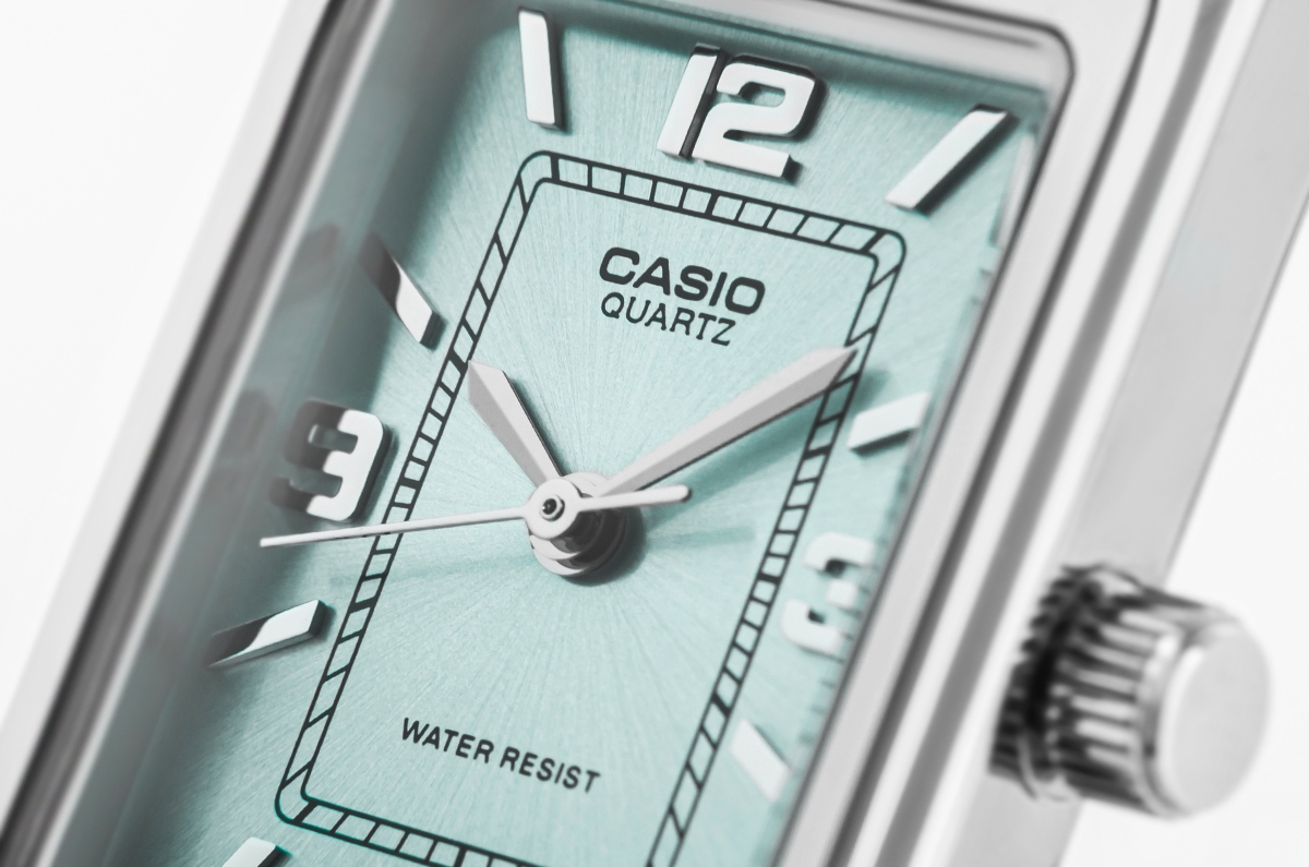 Ten model zegarka Casio to prawdziwa perełka dla kobiet ceniących elegancję i subtelny styl. Jego prostokątna koperta w srebrnym kolorze nadaje mu klasyczny, ale jednocześnie nowoczesny wygląd. Turkusowa tarcza przyciąga wzrok swoją świeżością i oryginalnością, a srebrne wskazówki i stylowe oznaczenia godzinowe sprawiają, że odczytanie godziny jest łatwe i komfortowe. Bransoleta ze stali nierdzewnej dodaje klasy i zapewnia wygodę noszenia przez cały dzień.