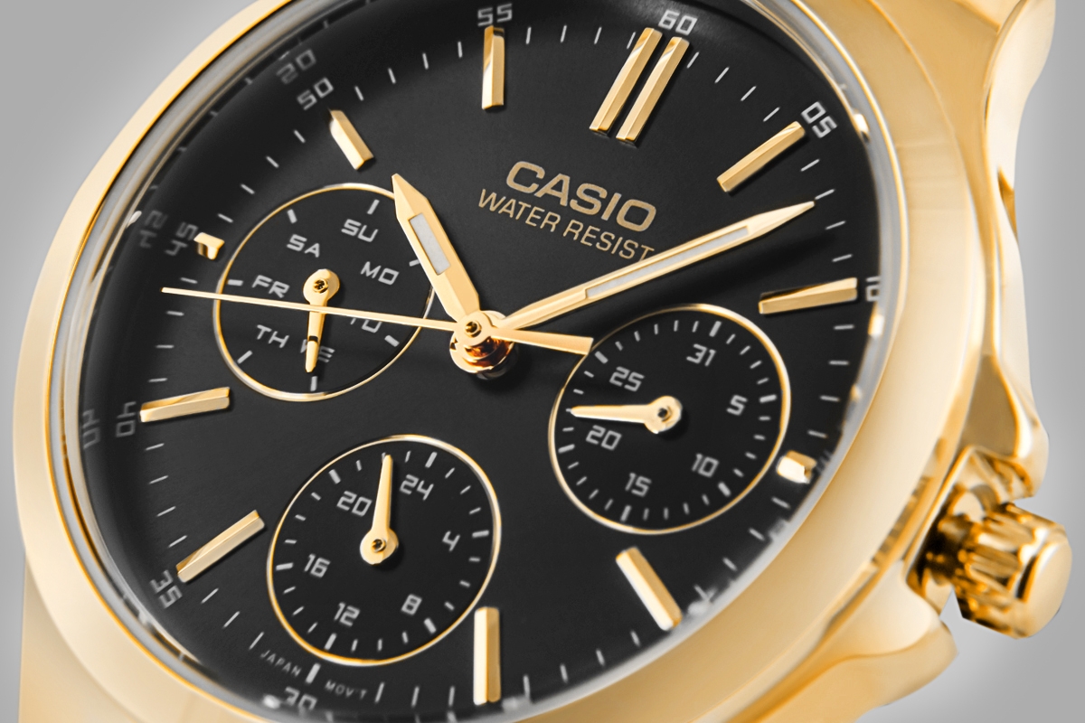 Zegarek CASIO LTP-V300G-1AUDF to połączenie luksusowego wyglądu i codziennej funkcjonalności. Jego elegancka bransoleta i dopracowana tarcza w matowej czerni sprawiają, że przyciąga wzrok i doskonale komponuje się z kobiecymi stylizacjami. Trzy dodatkowe subtarcze wskazują dzień tygodnia, datę i czas 24-godzinny, dzięki czemu zawsze masz wszystko pod kontrolą. To zegarek, który nie tylko zdobi nadgarstek, ale też ułatwia organizację dnia. Idealny dla kobiet, które lubią styl i wygodę w jednym.
