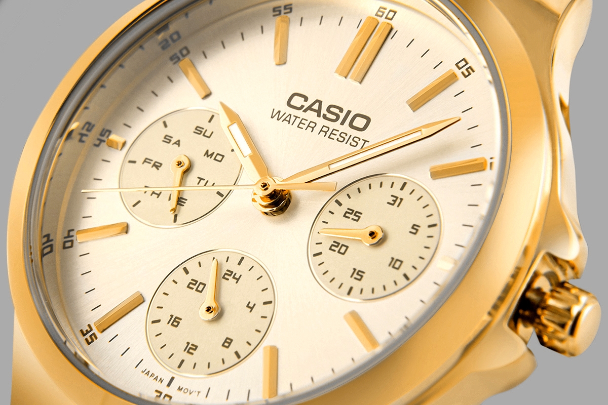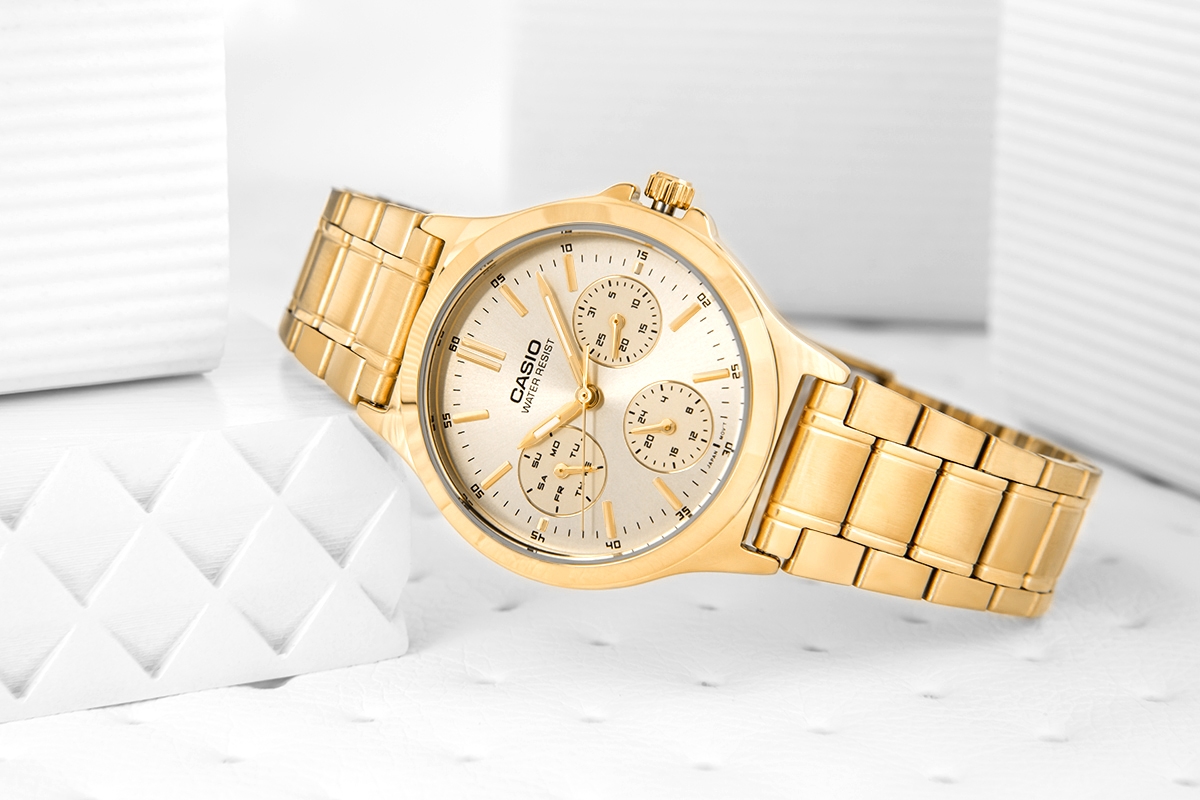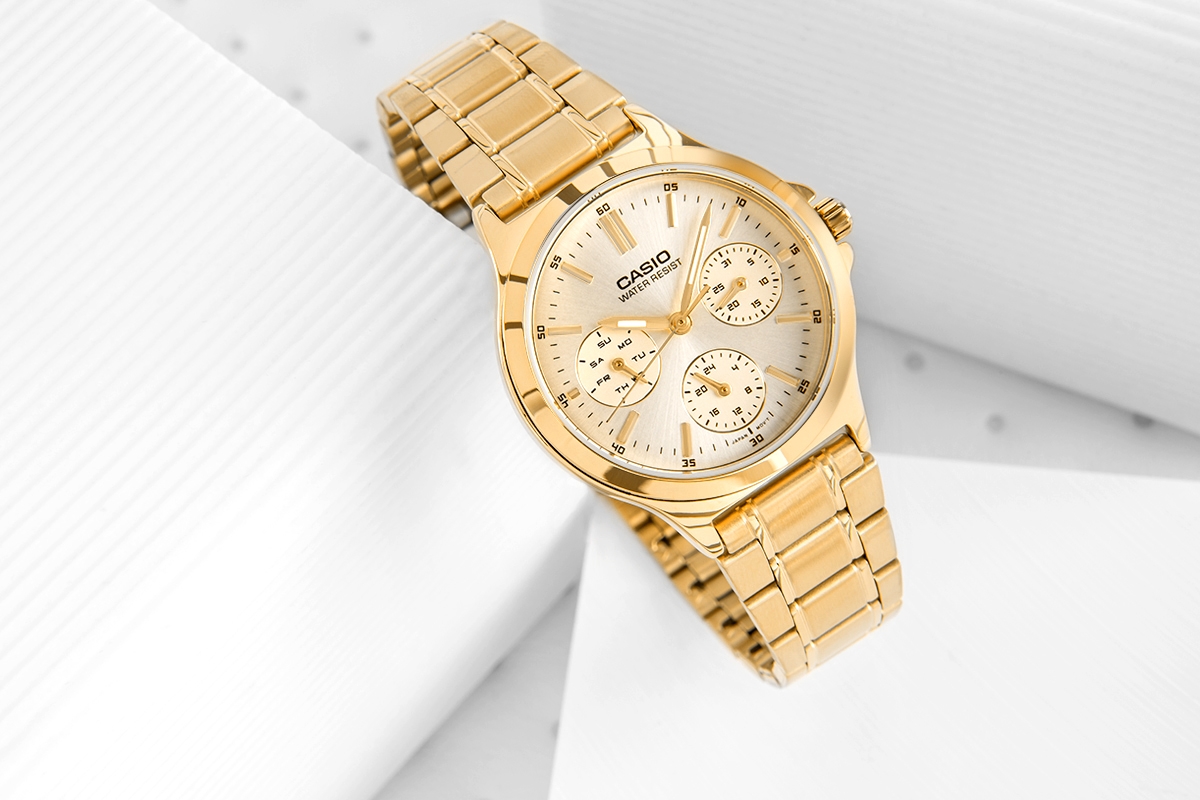 Zegarek CASIO LTP-V300G-9AUDF to połączenie luksusowego wyglądu i codziennej funkcjonalności. Jego elegancka bransoleta i dopracowana tarcza z delikatnym połyskiem sprawiają, że przyciąga wzrok i doskonale komponuje się z kobiecymi stylizacjami. Trzy dodatkowe subtarcze wskazują dzień tygodnia, datę i czas 24-godzinny, dzięki czemu zawsze masz wszystko pod kontrolą. To zegarek, który nie tylko zdobi nadgarstek, ale też ułatwia organizację dnia. Idealny dla kobiet, które lubią styl i wygodę w jednym.