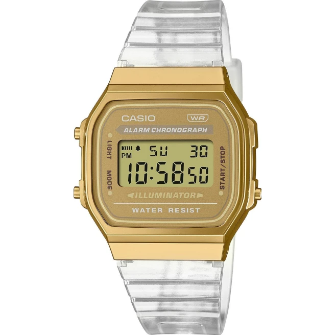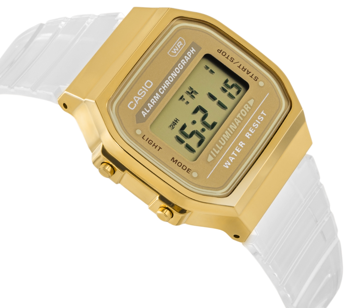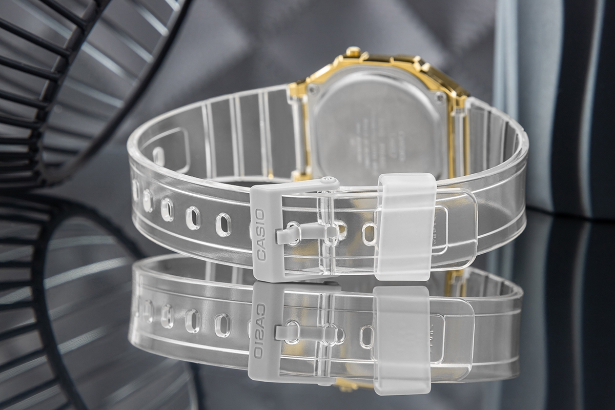 Casio Vintage A168XESG-9AEF to modowa odsłona klasycznego A168, utrzymana w klimacie lat 80. Transparentny pasek i złote wykończenie koperty sprawiają, że ten model wygląda lżej i bardziej stylizacyjnie niż klasyczne wersje na stalowej bransolecie.