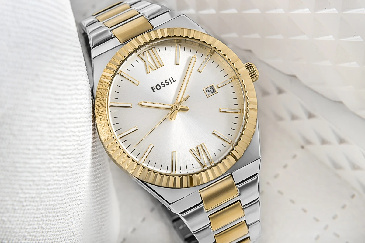Zegarek Fossil Scarlette to nie tylko czasomierz – to biżuteria, która pulsuje rytmem Twojego dnia. Srebrno-złota bransoleta oplata nadgarstek niczym luksusowa tkanina, łącząc klasyczną elegancję z nutą nowoczesnego stylu. Srebrna tarcza w wykończeniu sunray delikatnie igra ze światłem, niczym promienie słońca odbijające się od tafli wody. Każdy ruch nadgarstka wydobywa jej subtelny blask, podkreślając akcenty na tarczy rozświetlają ją i przywodząc na myśl migotliwe refleksy drogocennej biżuterii. Datownik, dyskretnie wkomponowany w design, sprawia, że ten zegarek jest nie tylko piękny, ale też praktyczny.