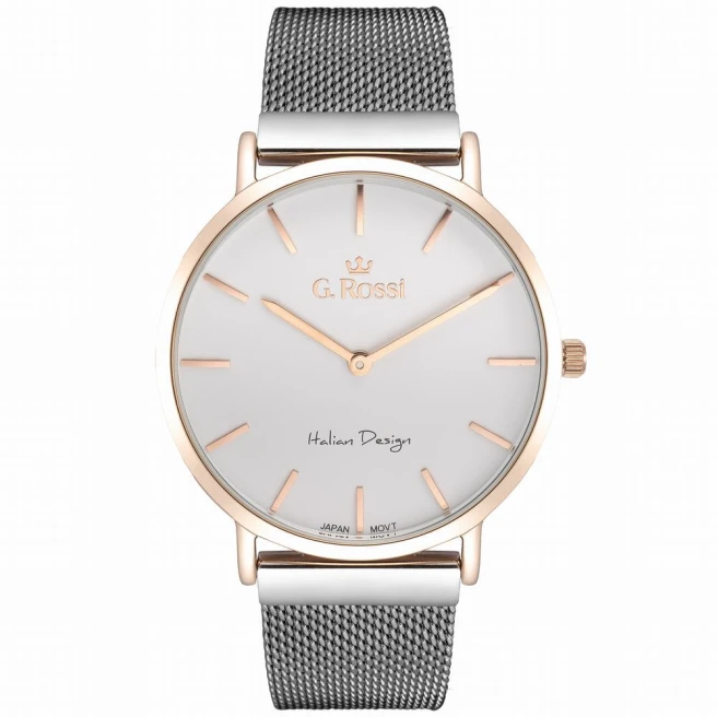 G.Rossi 10771B-3B4 to damski model na bransolecie mesh z kopertą 39 mm i lekką, kontrastową kolorystyką. Połączenie jasnej tarczy i ciepłej koperty daje temu zegarkowi elegantszy, bardziej dopracowany odbiór niż w jednolitych kolorystycznie wariantach.