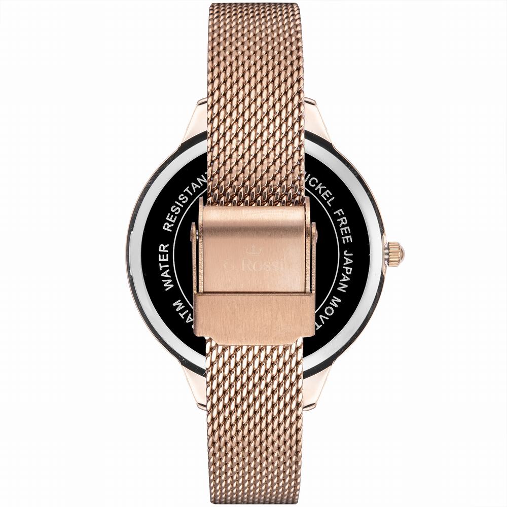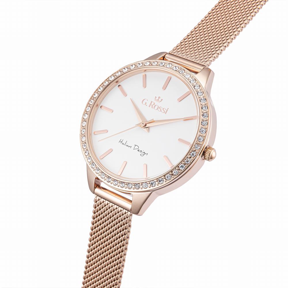 Zegarek damski G.Rossi na bransolecie typu mesh w kolorze różowego złota. Różowo-złote indeksy i wskazówki na białej tarczy bez cyfr. Różowo-złota koperta o średnicy 36 mm, ozdobiona cyrkoniami.