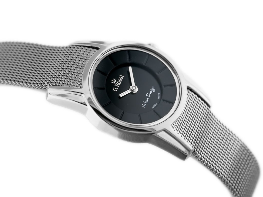 Mały zegarek damski marki G.Rossi na srebrnej bransolecie mesh. Srebrne wskazówki na czarnej tarczy bez cyfr. Srebrna koperta zegarka o średnicy 24 mm.