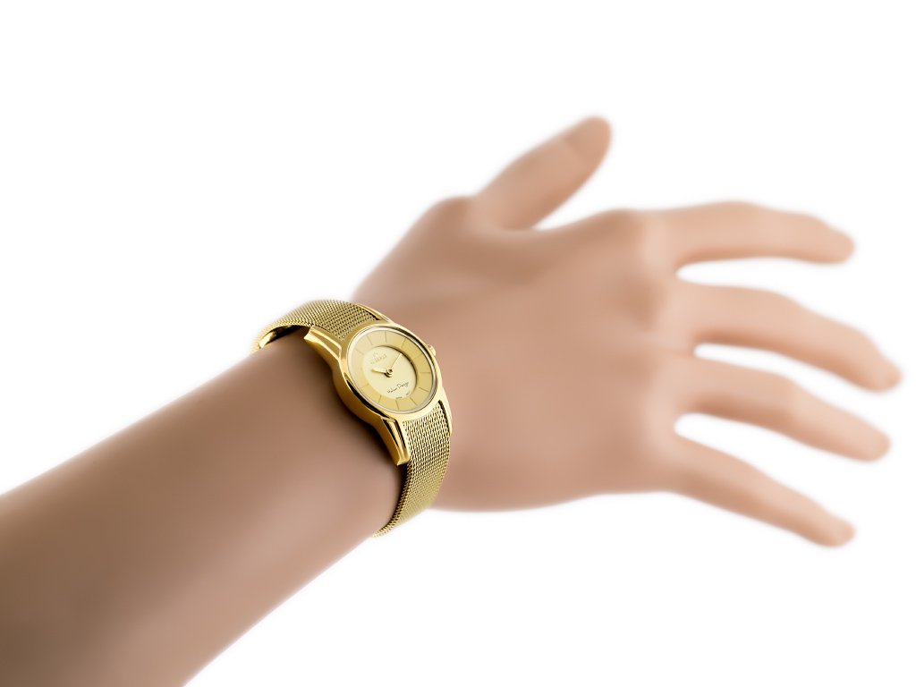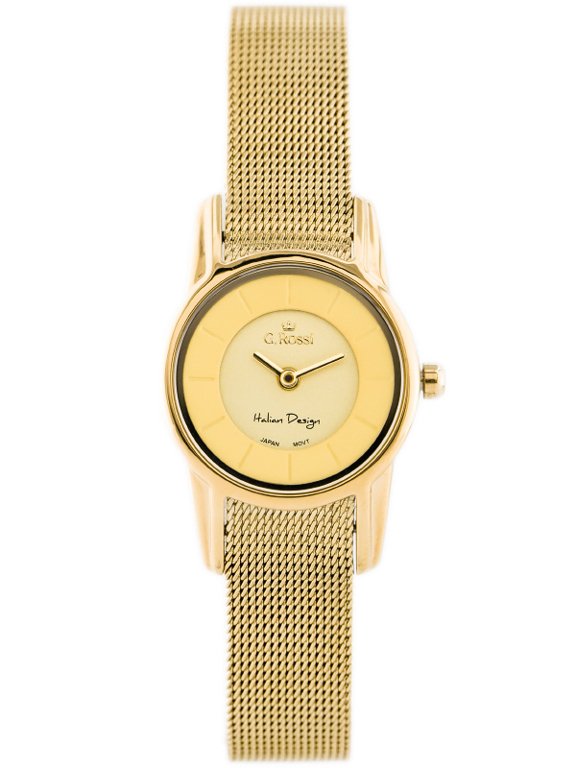 Mały zegarek damski marki G.Rossi na złotej bransolecie mesh. Złote wskazówki na złotej tarczy bez cyfr. Złota koperta zegarka o średnicy 24 mm.