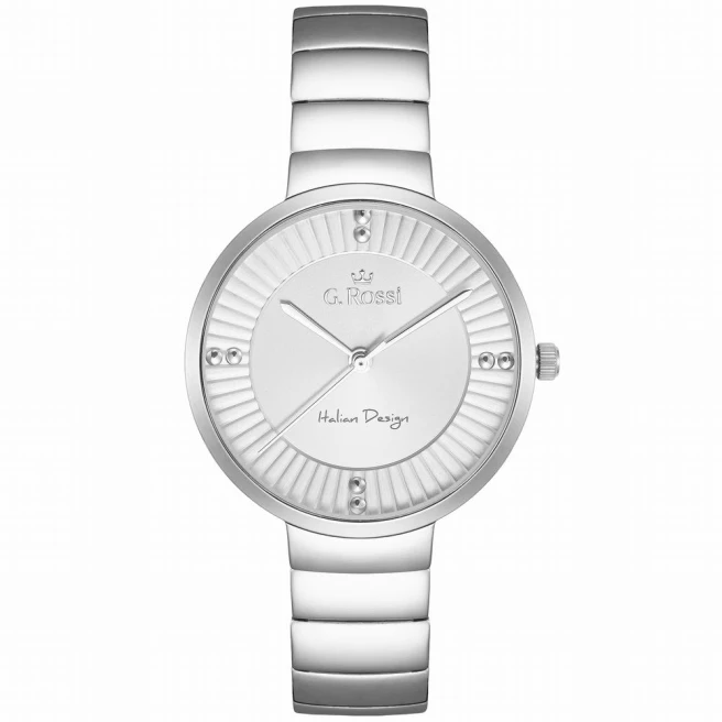 G.Rossi 12120B-3C1 to damski model na stalowej bransolecie z kopertą 34 mm i uporządkowaną, jednolitą kolorystycznie tarczą. Ten zegarek wygląda bardziej biżuteryjnie niż paskowe odpowiedniki, ale nie traci codziennej prostoty.