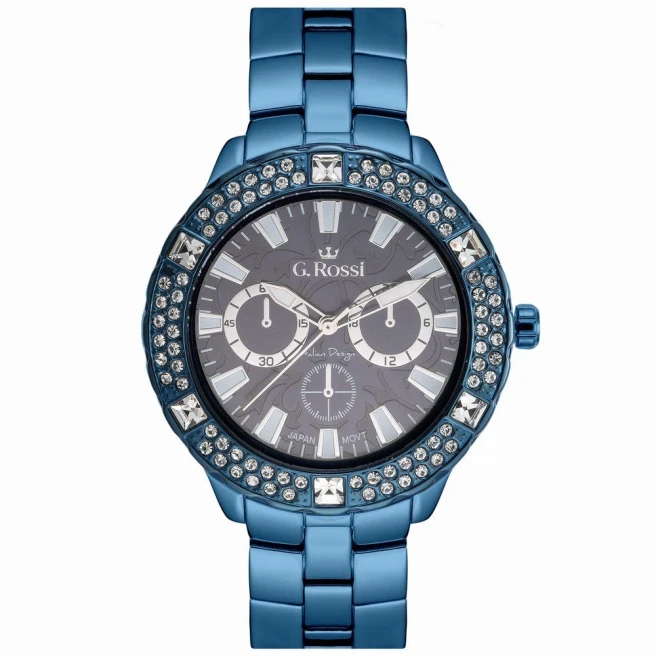 G.Rossi 8527B-6F1 to damski model na stalowej bransolecie z kopertą 40 mm, cyrkoniami przy kopercie i fluorescencyjnymi wskazówkami. Ten zegarek wygląda bardziej efektownie niż najprostsze gładkie modele, ale nadal zachowuje codzienny charakter.