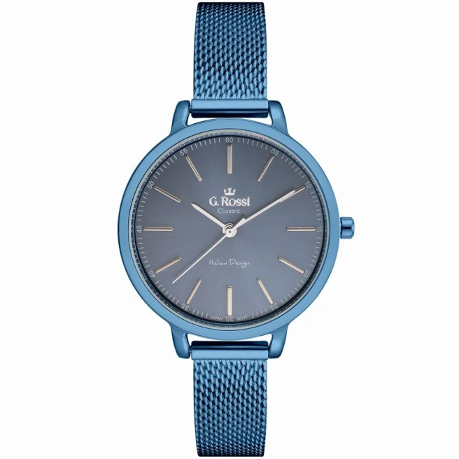 G.Rossi C11760B-6F1 to damski model na bransolecie mesh z kopertą 39 mm i cyrkoniami przy kopercie. Ten zegarek ma mocniejszą obecność na nadgarstku niż drobne modele biżuteryjne, ale nadal zachowuje kobiecy charakter.