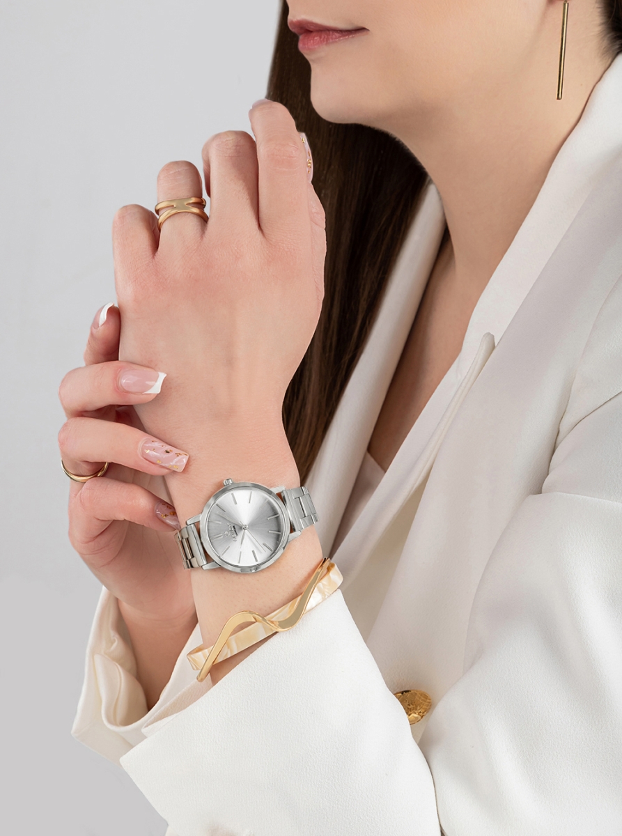 Charakter modelu: Srebrna tarcza i srebrna bransoleta budują elegancki, ozdobny efekt.