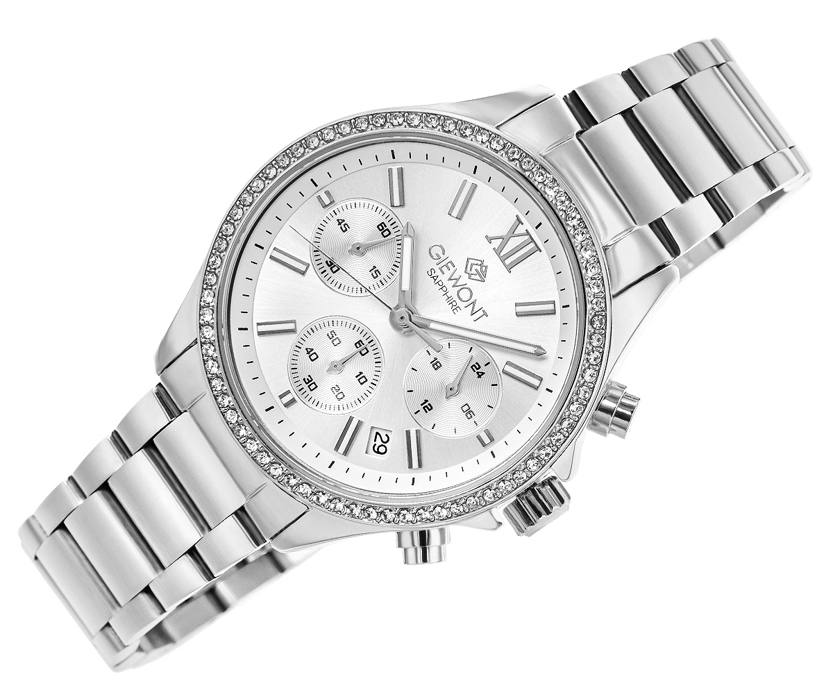 Najważniejsze cechy: mechanizm kwarcowy, szafirowe szkło, WR30, grubość koperty 12 mm, szerokość bransolety 18 mm, chronograf, cyrkonie, datownik, zegar 24h.