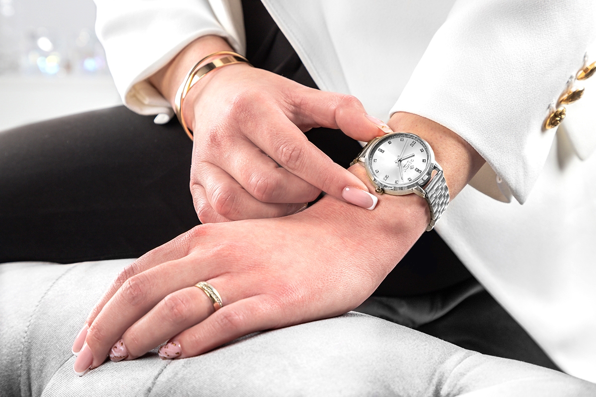 Najważniejsze cechy: mechanizm kwarcowy, szafirowe szkło, WR30, grubość koperty 9 mm, szerokość bransolety 14 mm, cyrkonie.