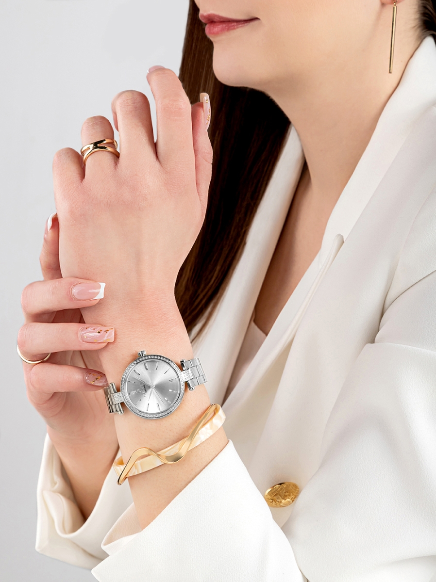 Charakter modelu: Srebrna tarcza i srebrna bransoleta budują elegancki, ozdobny efekt.