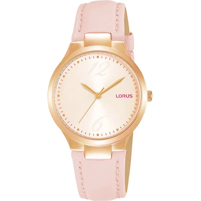 Lorus RG210UX9 to niewielki damski model z pudroworóżowym paskiem i różową tarczą sunray, który dobrze wypada tam, gdzie zegarek ma wyglądać lekko, spokojnie i kobieco. Koperta 30 mm pozostaje lekka i wygodna na co dzień.