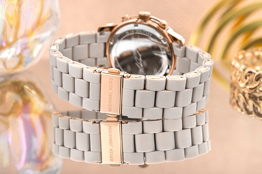 Michael Kors Runway MK7386 to wyraz nowoczesnego stylu i elegancji w luksusowym wydaniu. Wykonany z wysokiej jakości stali szlachetnej w kolorze różowego złota, zachwyca subtelnym blaskiem i ponadczasowym designem. Beżowa tarcza z delikatnymi indeksami i logo Michael Kors podkreśla minimalistyczny charakter modelu, a dopasowana bransoleta stalowo-silikonowa dodaje mu subtelnego uroku. Napędzany precyzyjnym mechanizmem kwarcowym, zegarek gwarantuje niezawodne działanie każdego dnia. Wodoszczelność 10 ATM sprawia, że świetnie sprawdzi się w codziennym użytkowaniu, a także podczas wakacyjnych aktywności. To idealny wybór dla kobiet, które cenią elegancję, funkcjonalność i modny wygląd w jednym.