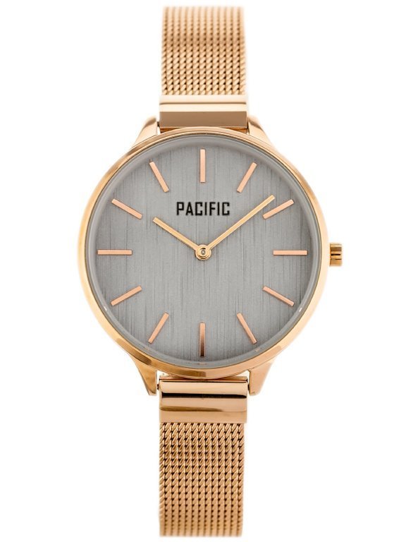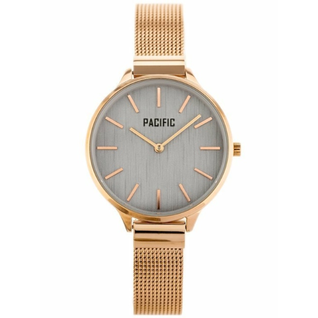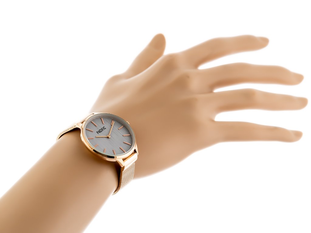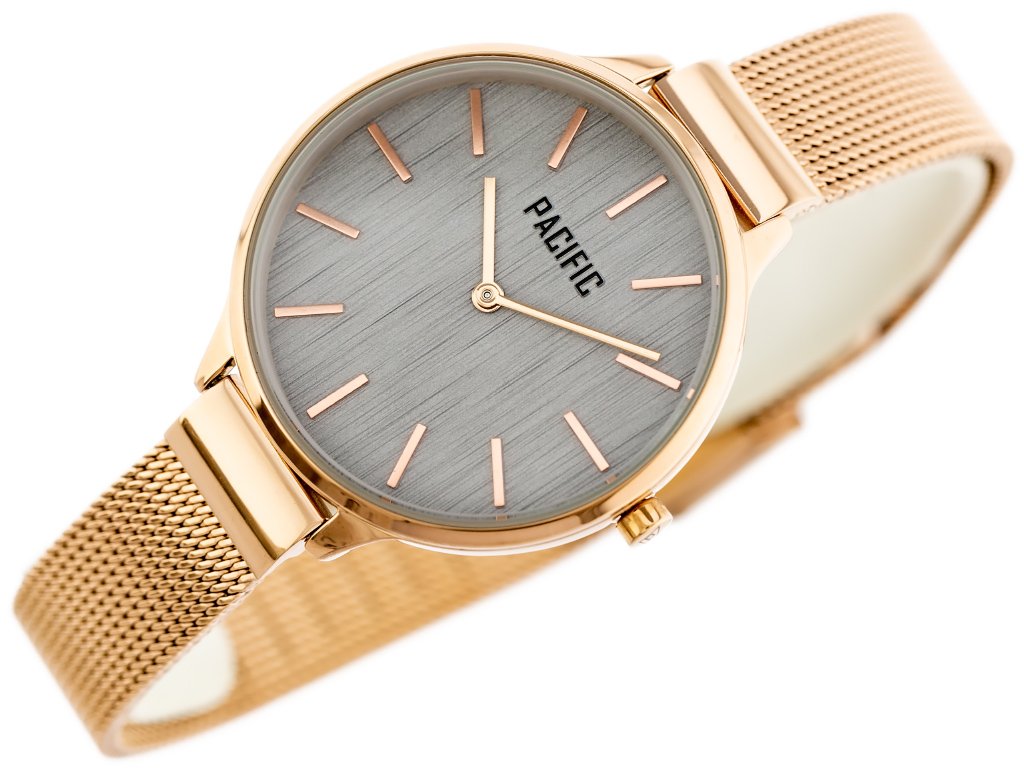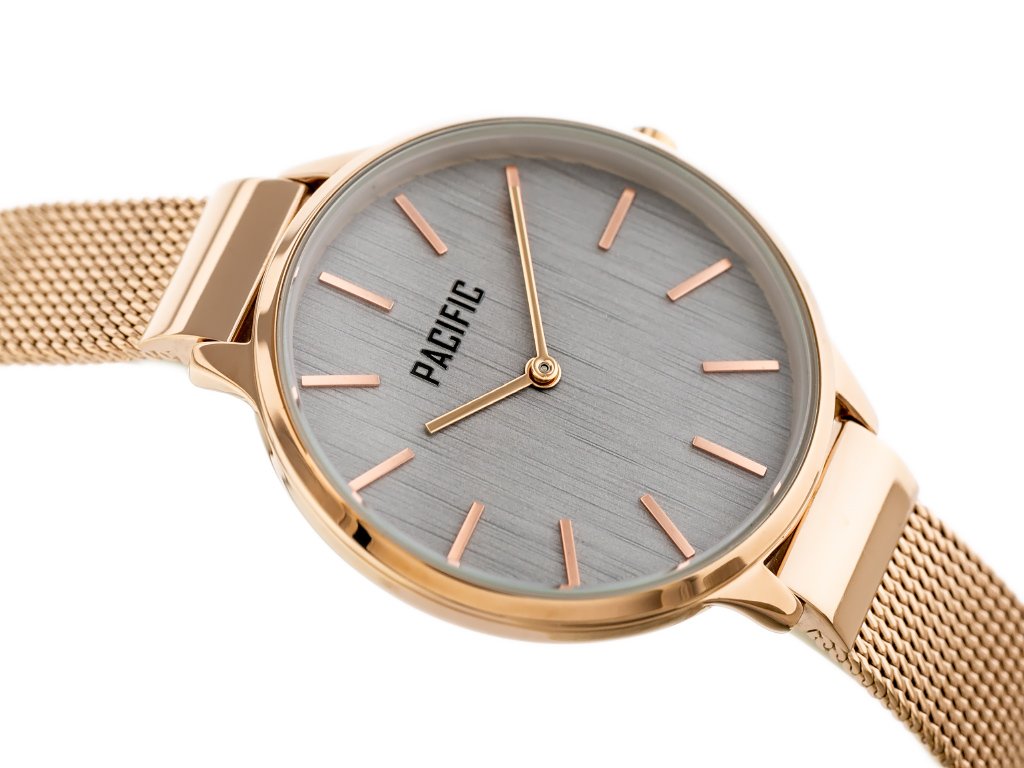 Zegarek damski marki Pacific na różowozłotej bransolecie typu mesh. Różowozłote wskazówki i indeksy na szarej tarczy bez cyfr. Różowozłota koperta zegarka o średnicy 38 mm.