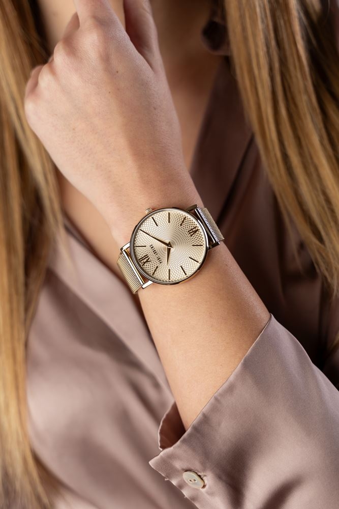 Charakter modelu: złota bransoleta mesh i złota tarcza nadają tej wersji bardziej wyraźny, dopracowany wygląd.