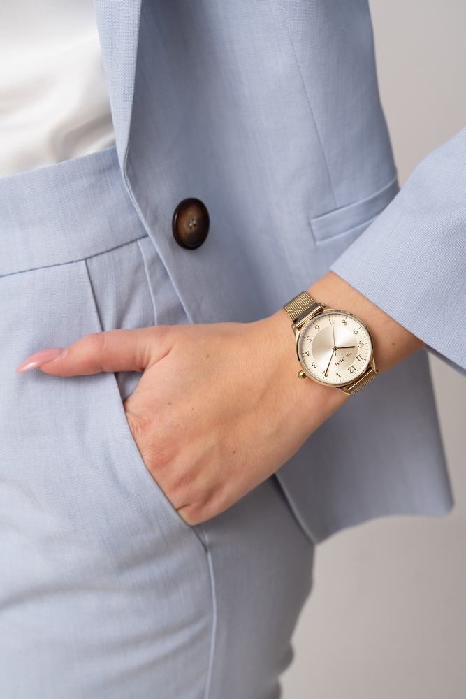 Charakter modelu: złota bransoleta mesh i złota tarcza nadają tej wersji bardziej wyraźny, dopracowany wygląd.