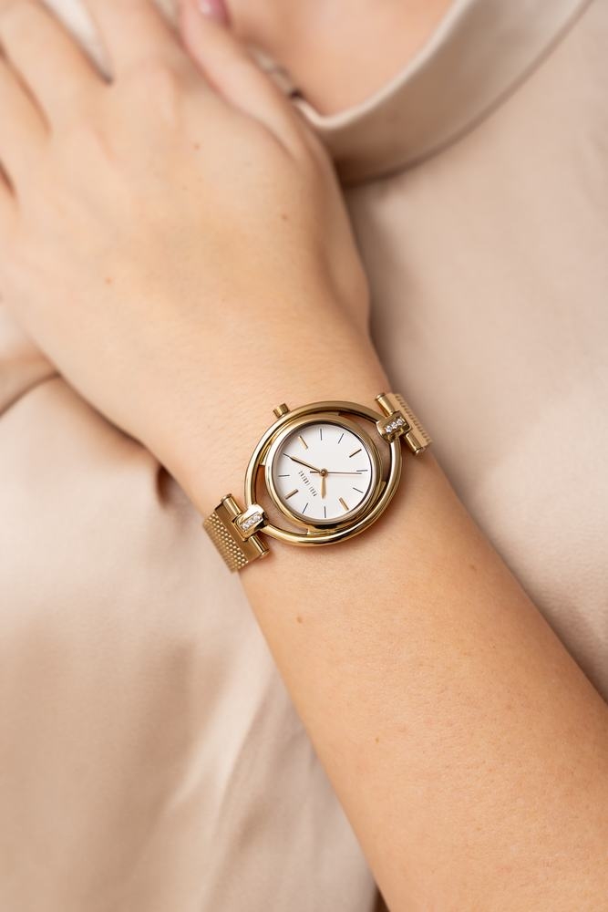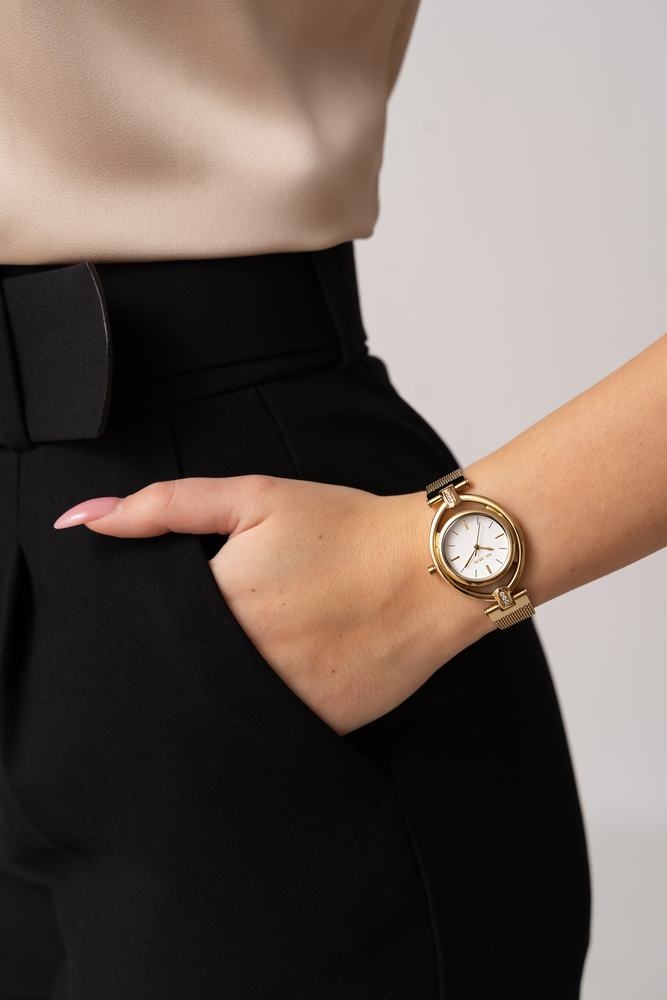 Charakter modelu: złota bransoleta mesh i biała tarcza nadają tej wersji bardziej wyraźny, dopracowany wygląd.