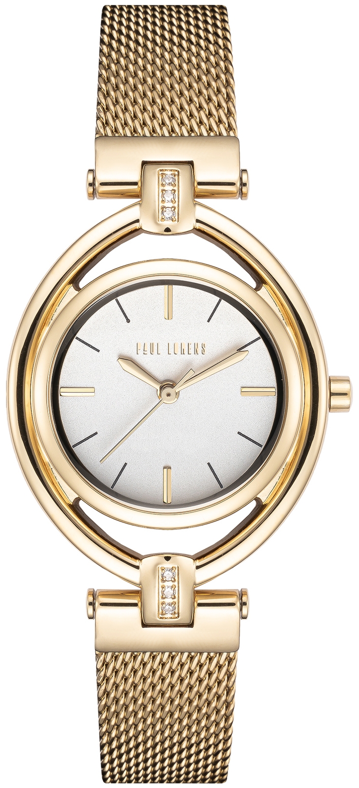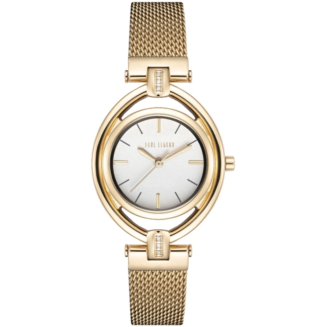 Paul Lorens PL13628B-3D1 to drobny damski model na bransolecie mesh z kopertą 30 mm i ozdobnymi cyrkoniami przy elementach łączących kopertę z bransoletą. Ten model wypada subtelnie i bardziej biżuteryjnie niż większe zegarki codzienne, a siatka dodaje jej lekkości na nadgarstku.