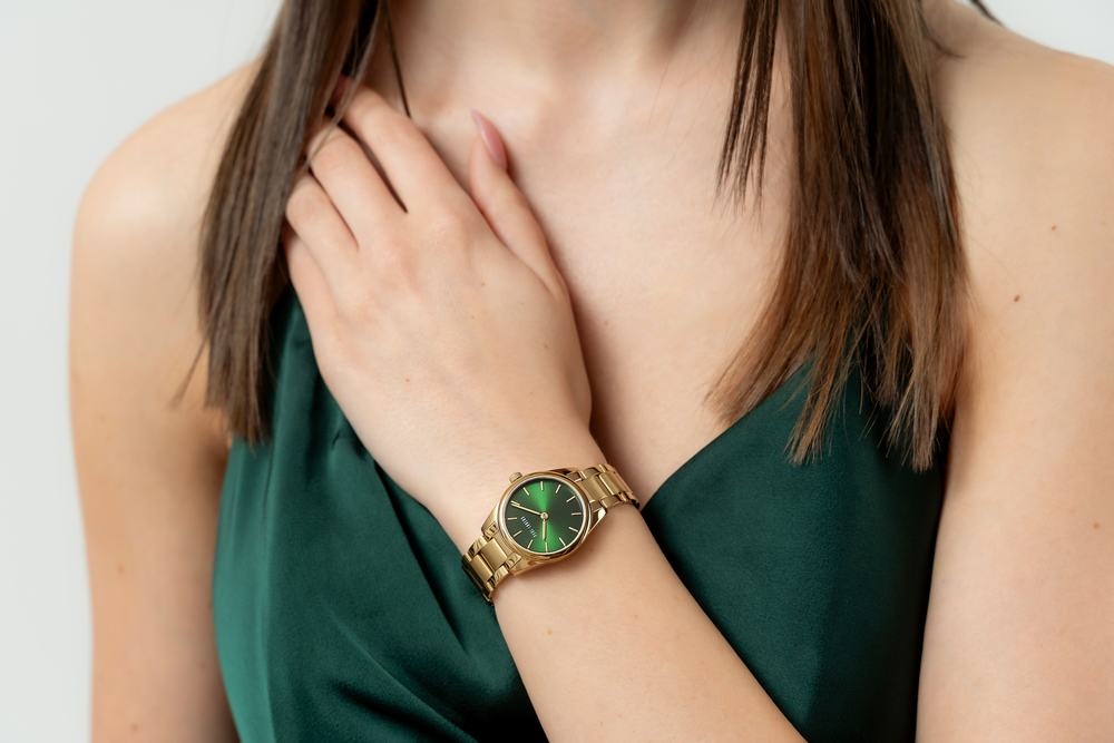- Tarcza: szmaragdowa zieleń z delikatnym, promienistym efektem satynowego połysku