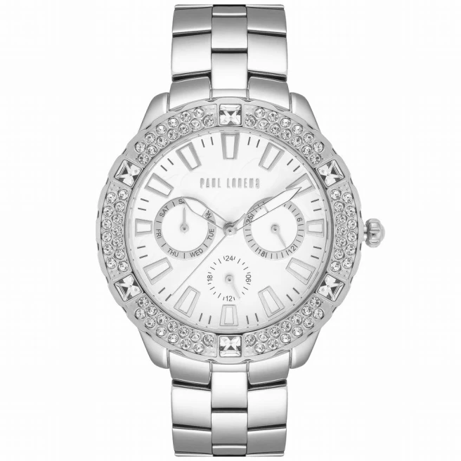 Paul Lorens PL8527B3-3C1 to damski model na stalowej bransolecie z kopertą 39 mm, cyrkoniami i bardziej ozdobną tarczą. Ten model ma dekoracyjne subtarcze, ale jego najmocniejszy efekt budują cyrkonie i lekko rozświetlone wskazówki.
