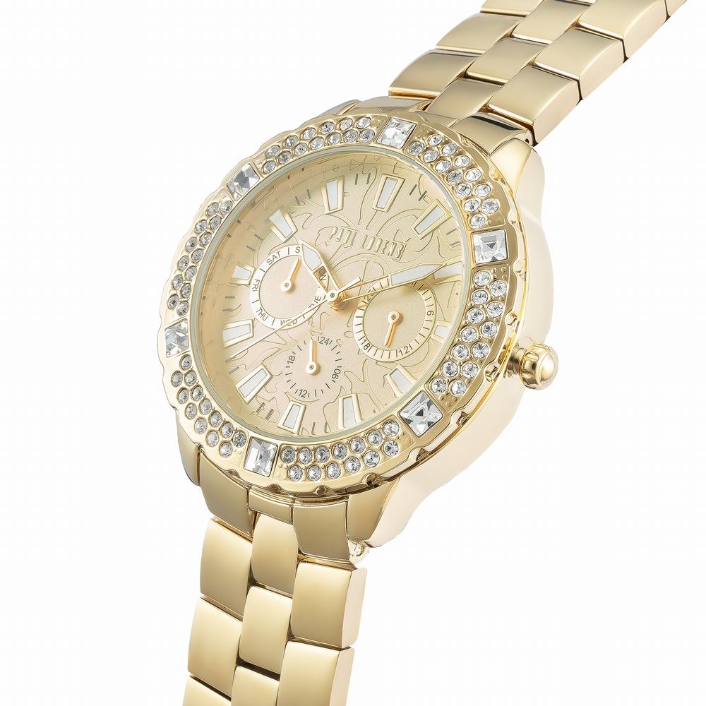 Efektowny i lśniący zegarek damski w złotej kolorystyce, ozdobiony blaskiem cyrkonii wokół tarczy. Miodowa tarcza z dekoracyjnymi chronografami oraz fluorescencyjnymi wskazówkami przyciąga uwagę i podkreśla elegancję. Ten model to idealny wybór dla kobiet, które cenią dodatki o wyjątkowym charakterze.