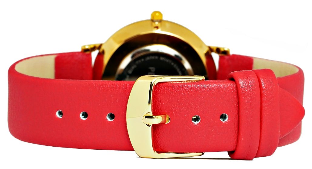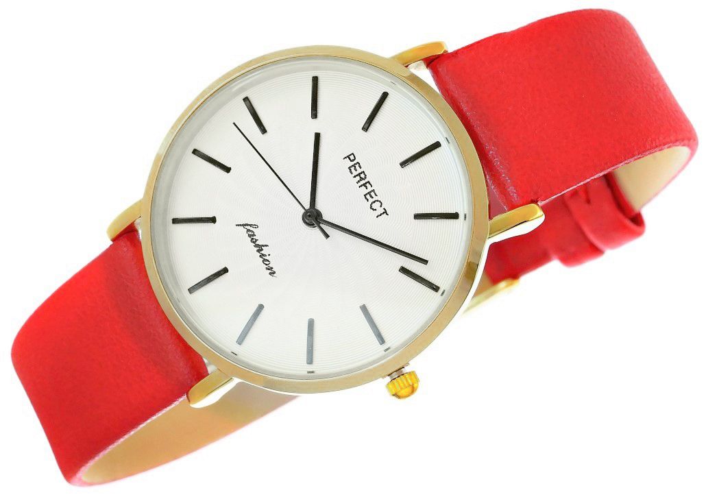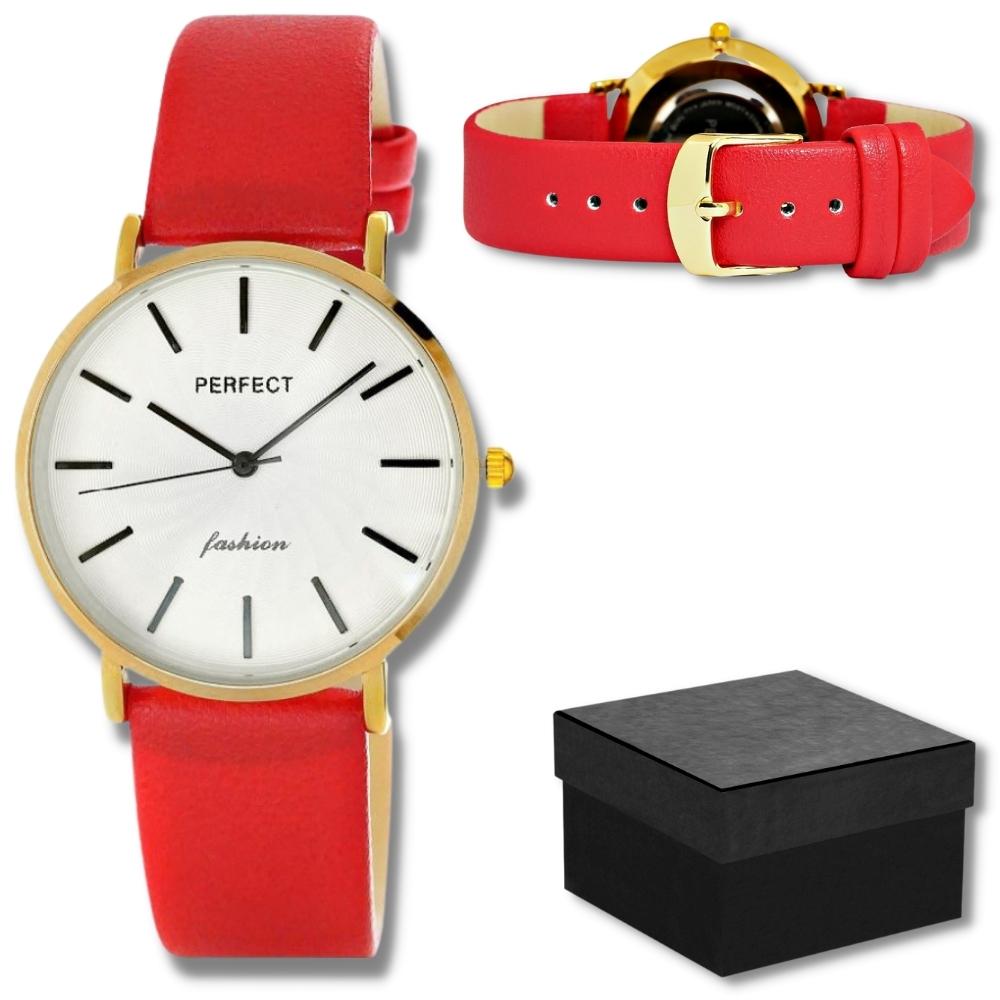 Elegancki zegarek damski marki Perfect na czerwonym skórzanym pasku. Czarne wskazówki i indeksy na białej, wzorzystej tarczy bez cyfr. Złota koperta zegarka w rozmiarze 36 mm.