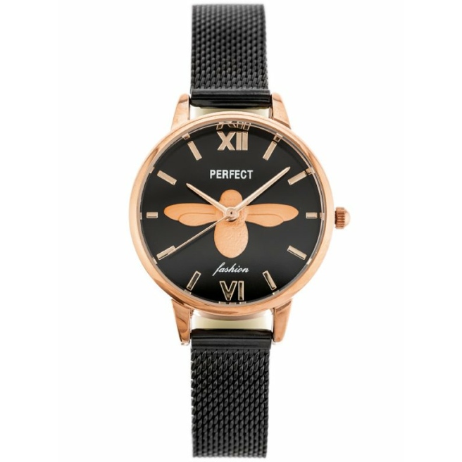 Kolorystyka zegarka jest elegancka i uniwersalna – czarna bransoleta i czarna tarcza z różowozłotą pszczołą na tle różowozłotych indeksów oraz koperty sprawiają, że zegarek damski Perfect S639-6 pasuje do wielu stylizacji i okazji.