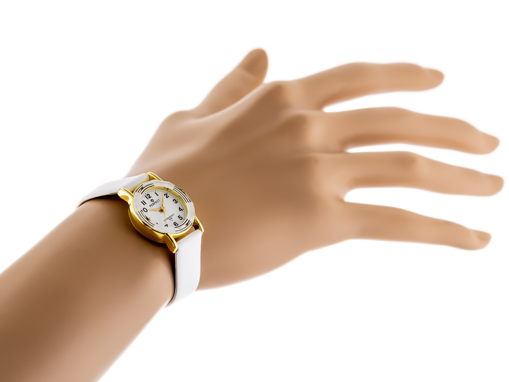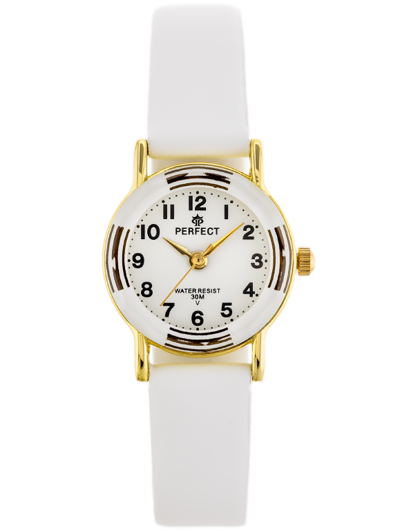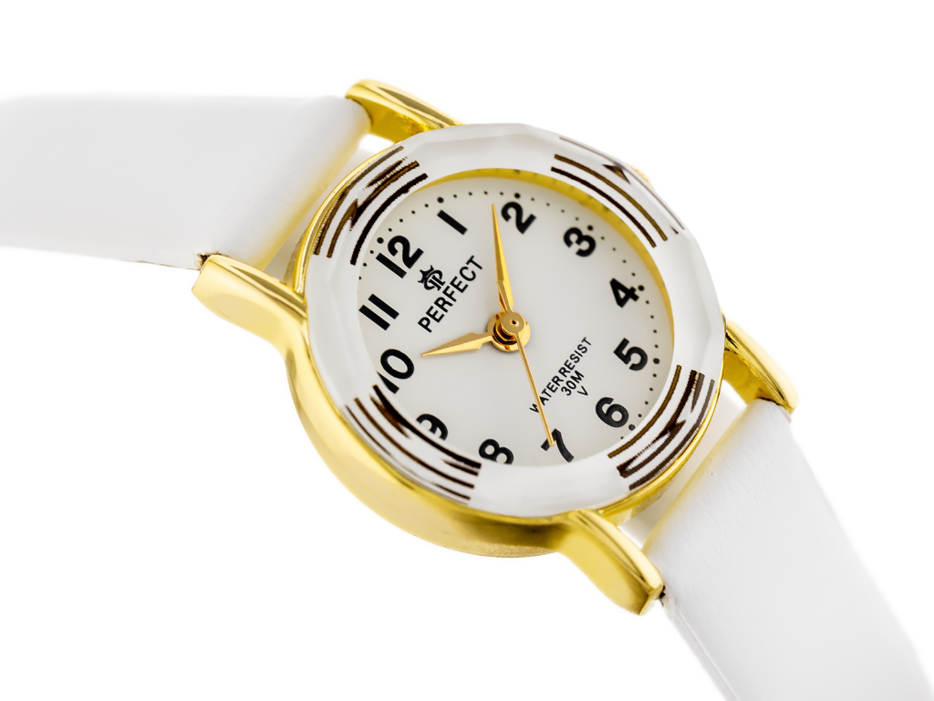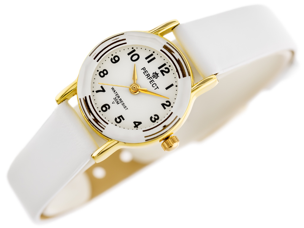 Zegarek prezentowy dla dziecka marki Perfect na Komunię Świętą. Zegarek na białym skórzanym pasku. Złote wskazówki, czarne indeksy na białej tarczy z cyframi arabskimi. Złota koperta (z motywem) w rozmiarze 23 mm.
