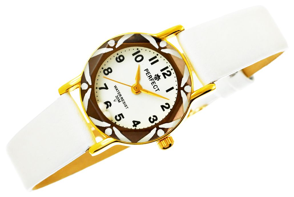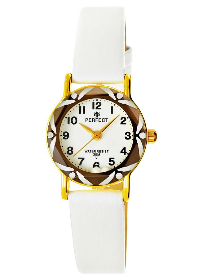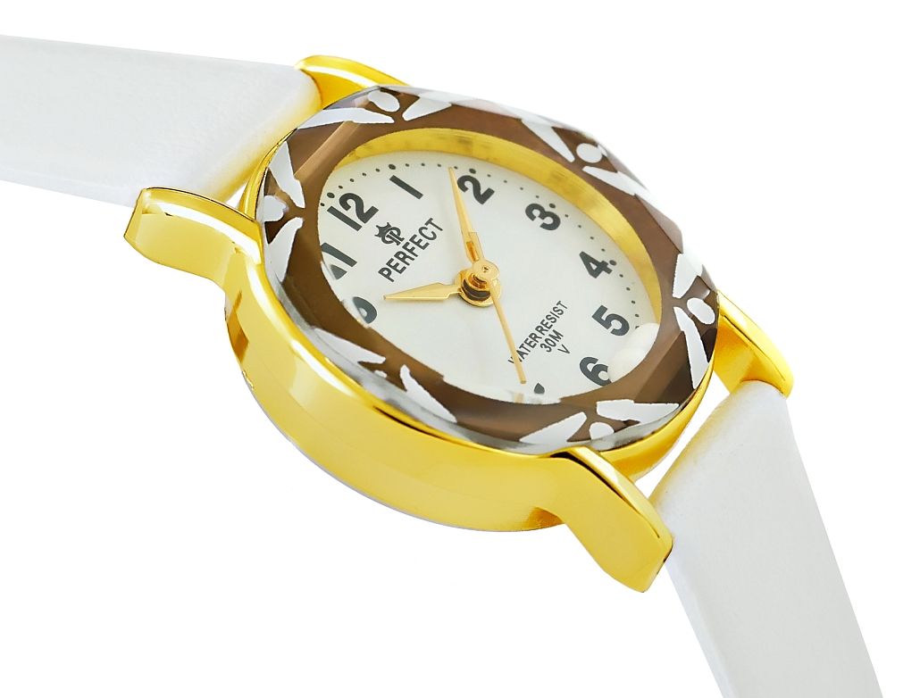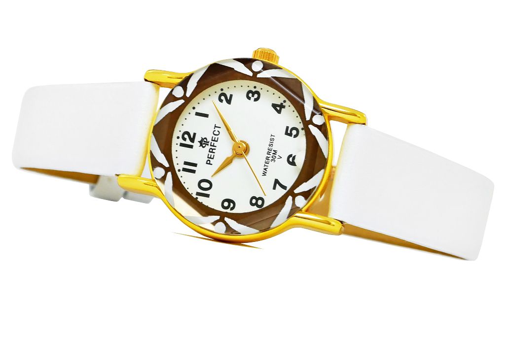 Zegarek prezentowy dla dziecka marki Perfect na Komunię Świętą. Zegarek na białym skórzanym pasku. Złote wskazówki, czarne indeksy na białej tarczy z cyframi arabskimi. Złota koperta (z motywem) w rozmiarze 23 mm.