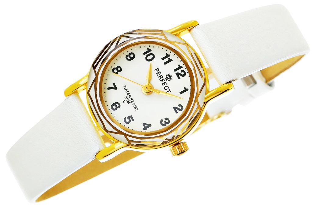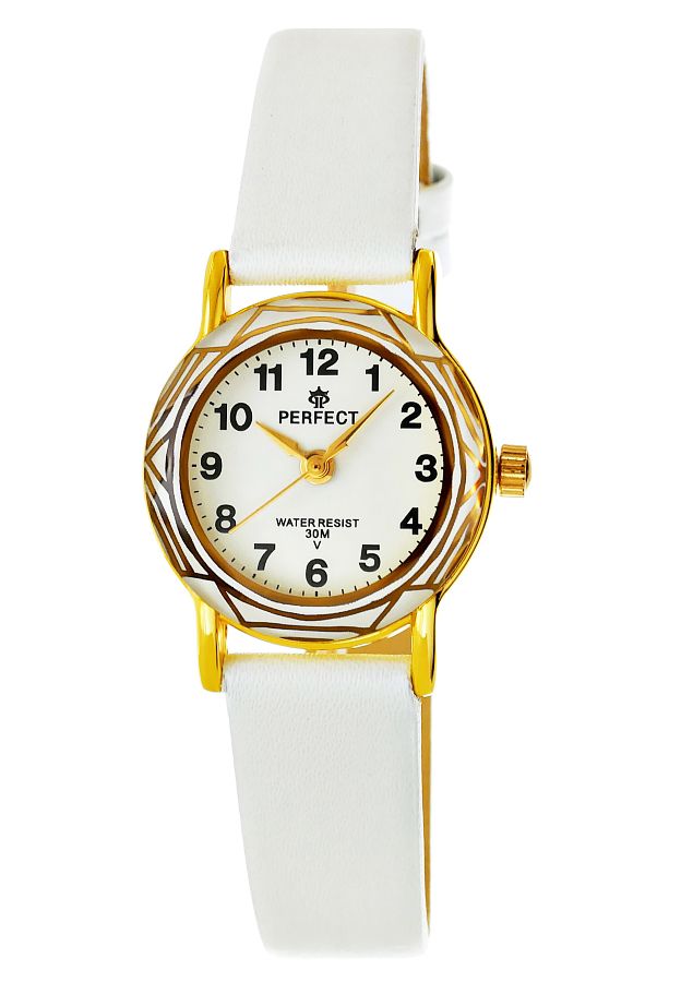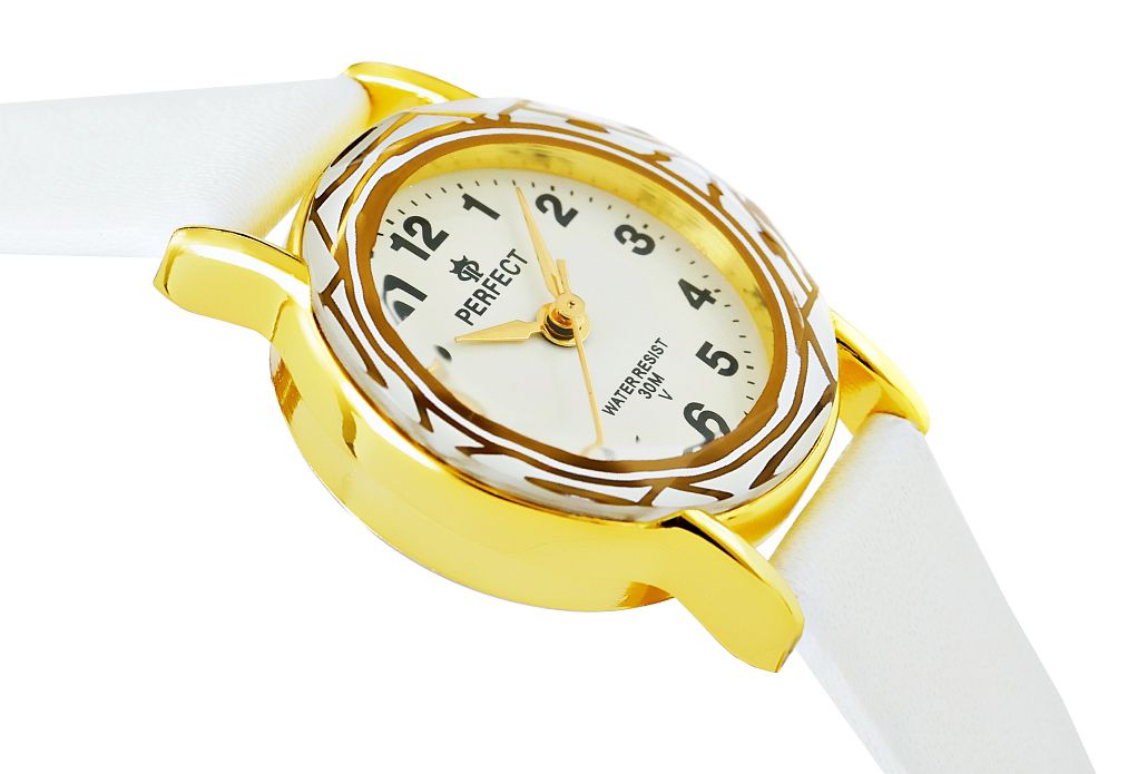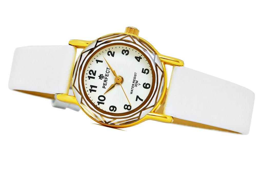 Zegarek prezentowy dla dziecka marki Perfect na Komunię Świętą. Zegarek na białym skórzanym pasku. Złote wskazówki, czarne indeksy na białej tarczy z cyframi arabskimi. Złota koperta (z motywem) w rozmiarze 23 mm.