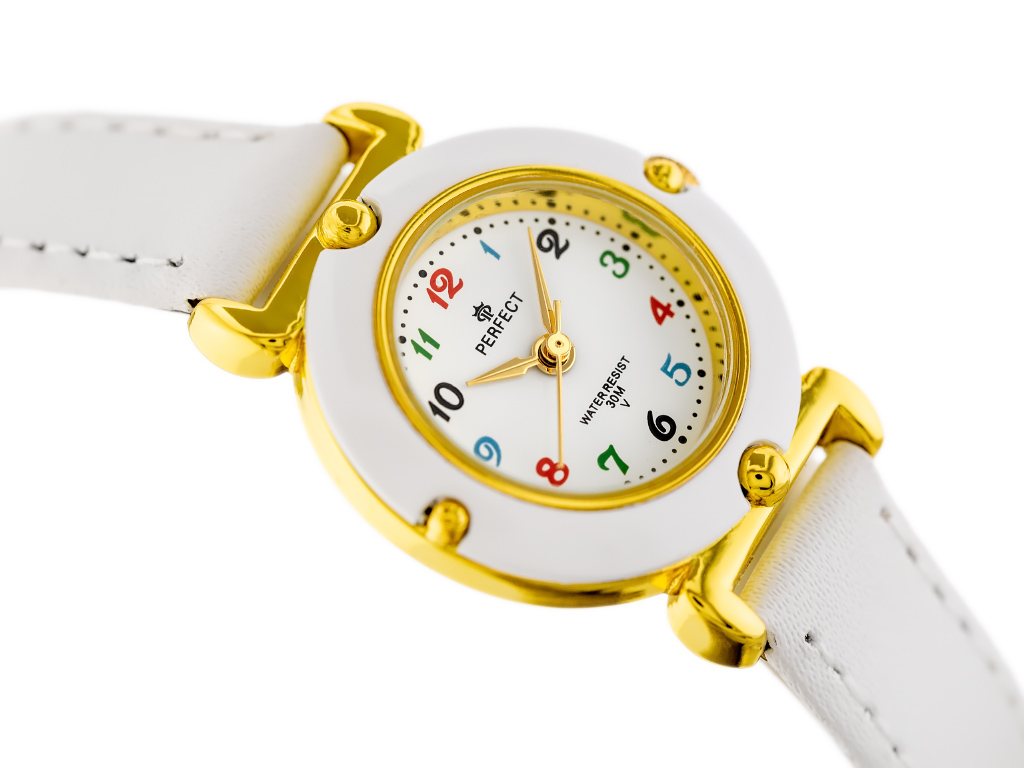 Zegarek prezentowy dla dziecka marki Perfect na Komunię Świętą. Zegarek na białym skórzanym pasku. Złote wskazówki, kolorowe indeksy na białej tarczy z cyframi arabskimi. Biało-złota koperta zegarka w rozmiarze 25 mm.